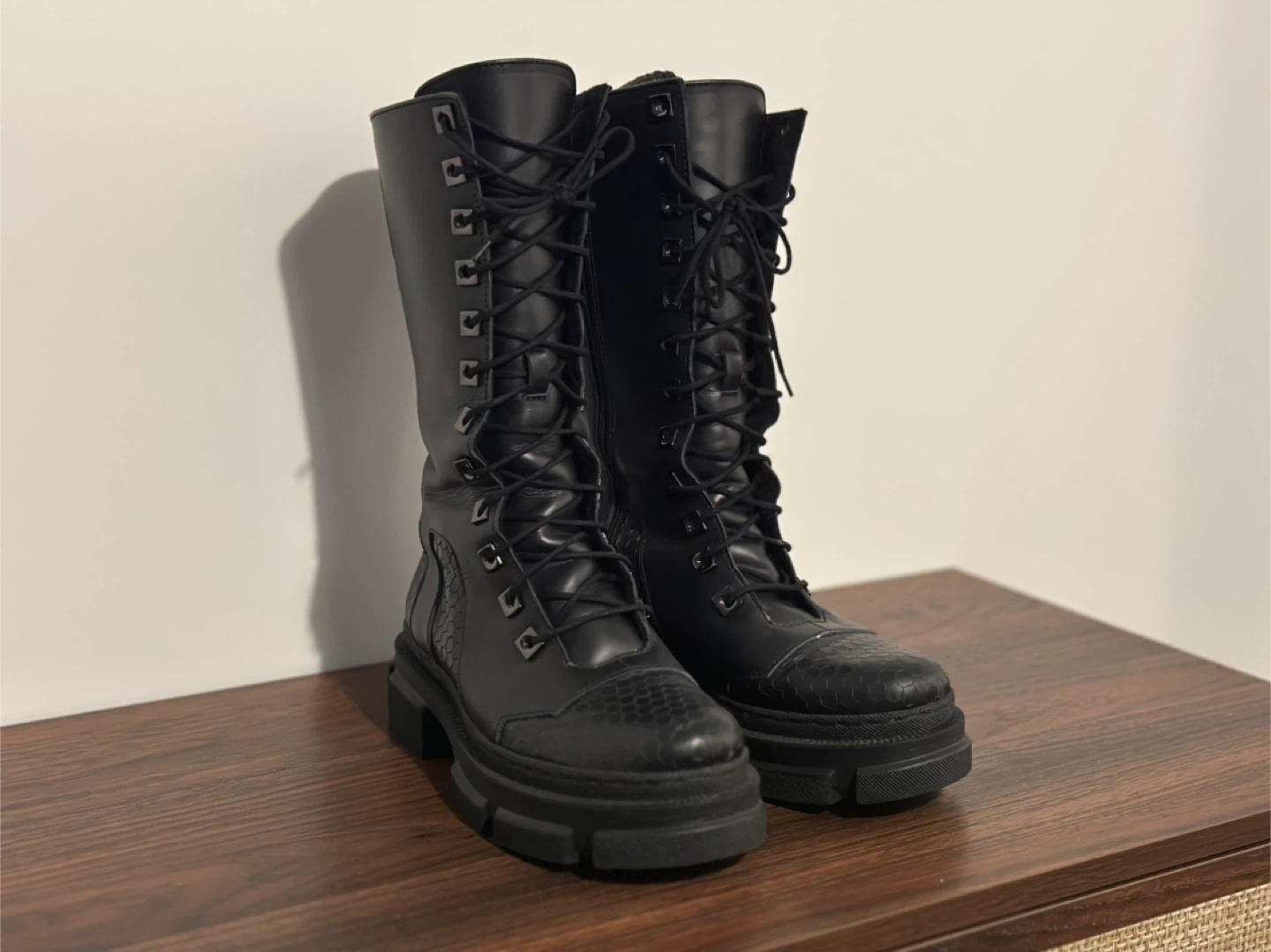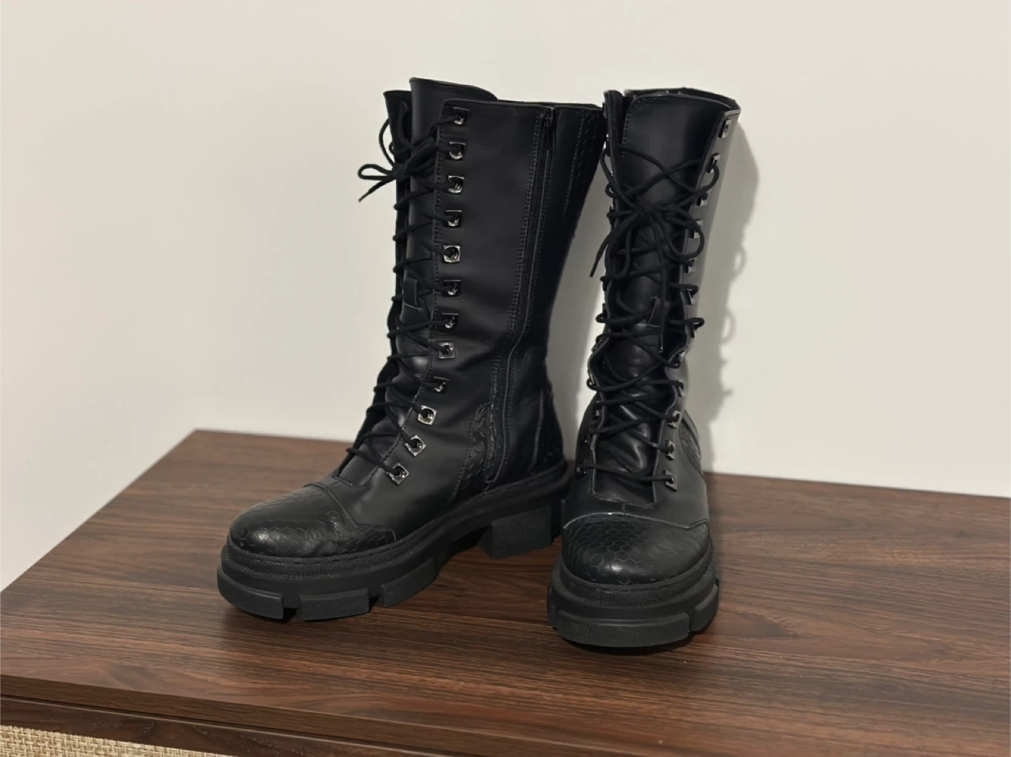 These MAS LAUS boots are black with a lace-up front and side zipper. They feature a textured detail on the toe and heel, plus a chunky platform sole. Comfortable and stylish for everyday wear!