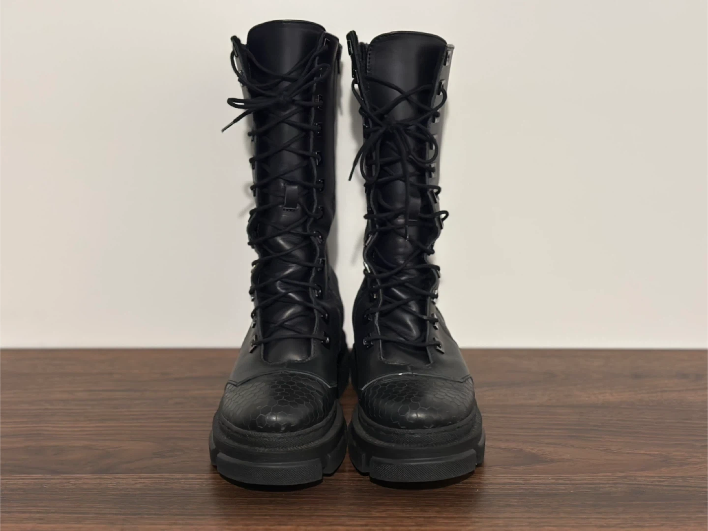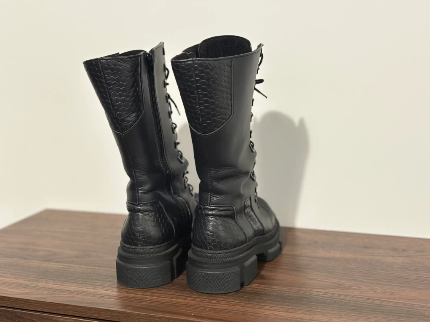 These MAS LAUS boots are black with a lace-up front and side zipper. They feature a textured detail on the toe and heel, plus a chunky platform sole. Comfortable and stylish for everyday wear!