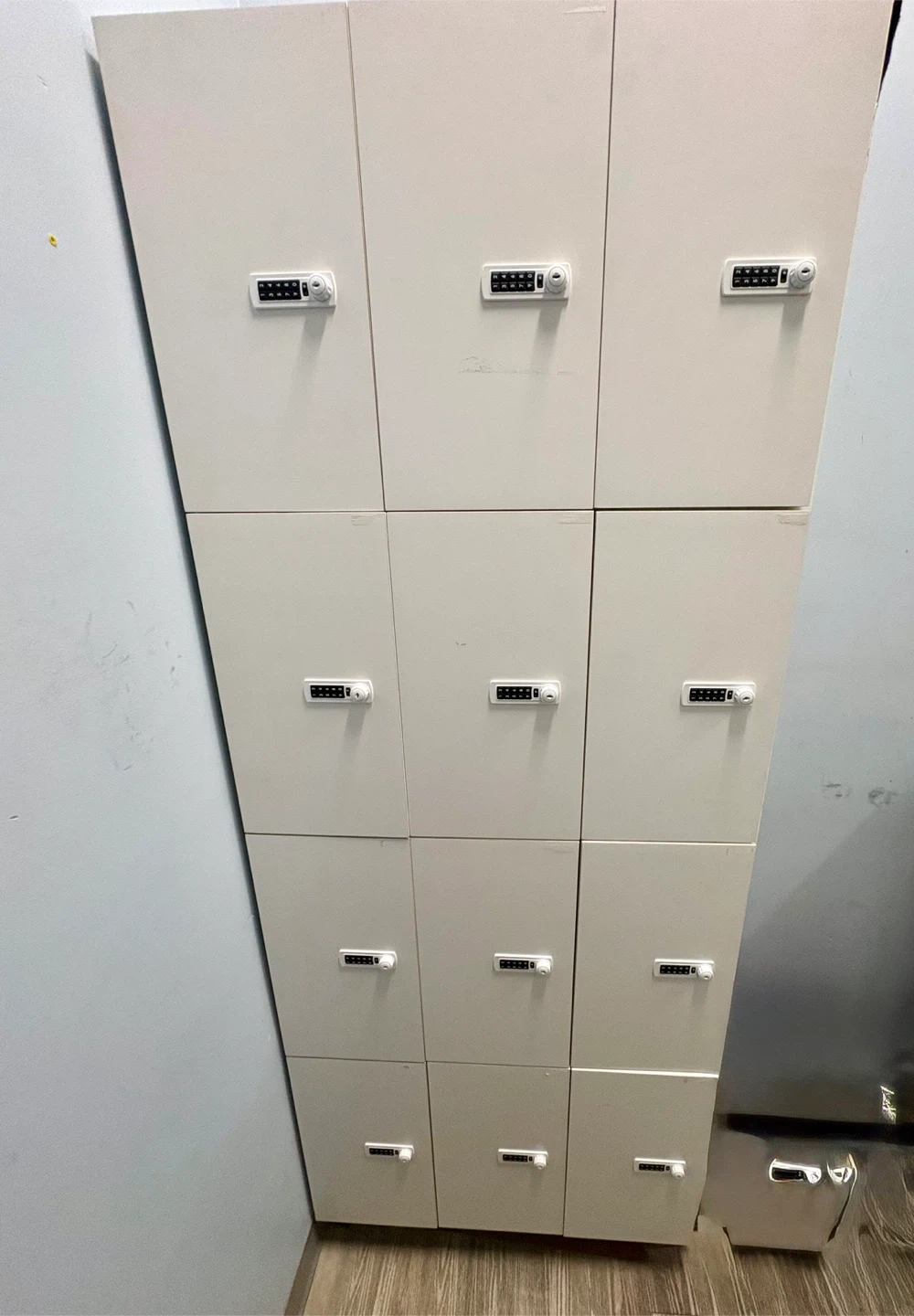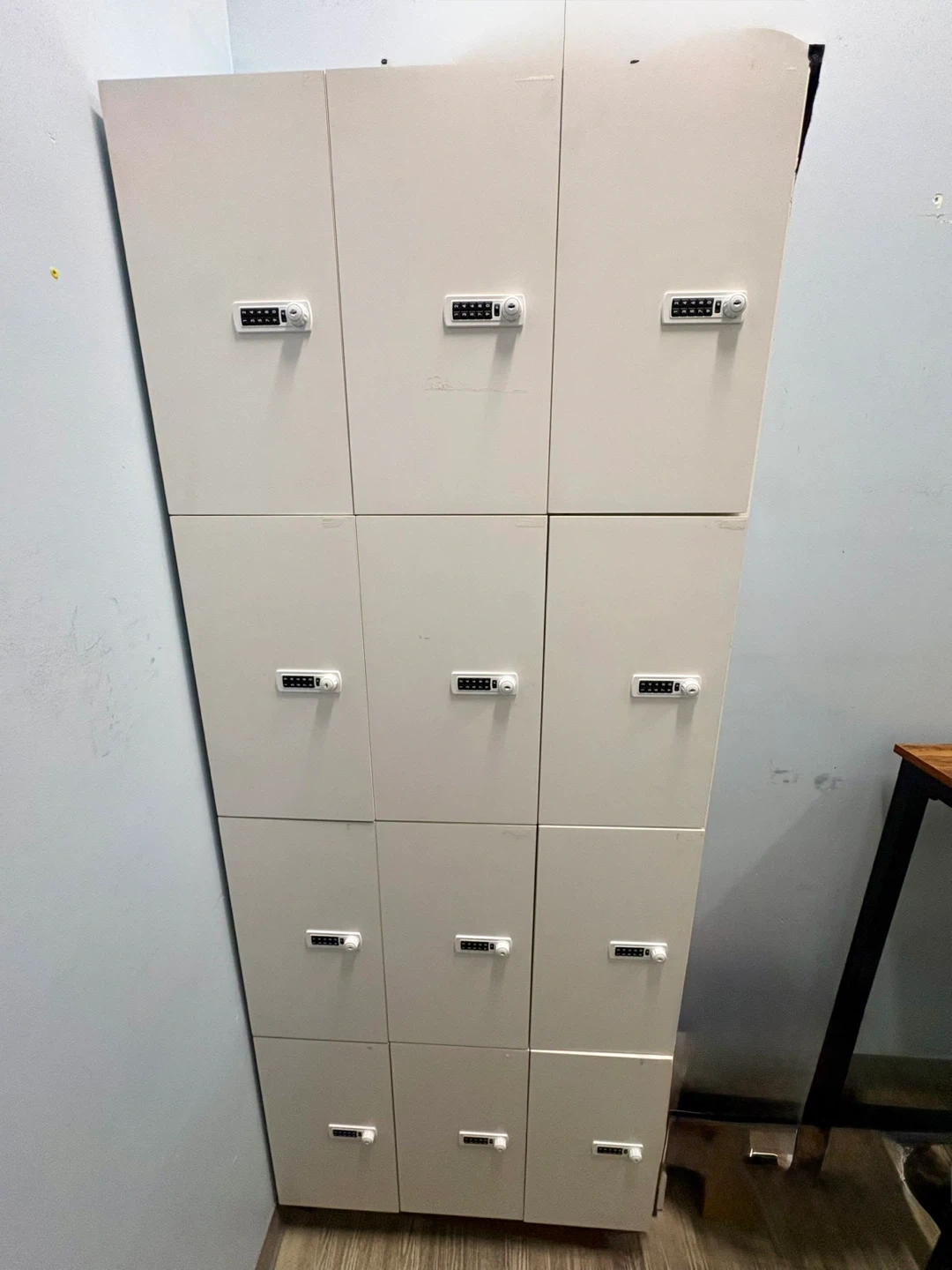 This is a set of custom made lockers. Each locker has a digital combination lock for security. They're great for storage in gyms, dance studios, schools, or offices.