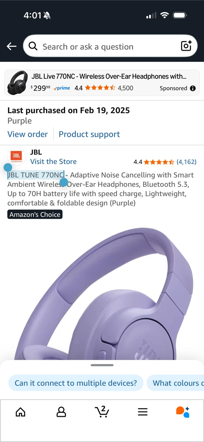 These are JBL Live 770NC wireless over-ear headphones in a nice purple colour. They include noise cancellation and Bluetooth 5.3. Comes with original charging cable and audio cable. Also includes a protective carrying case. Used less than 5 times, in great condition. Case was an additional purchase but included in pricing here.