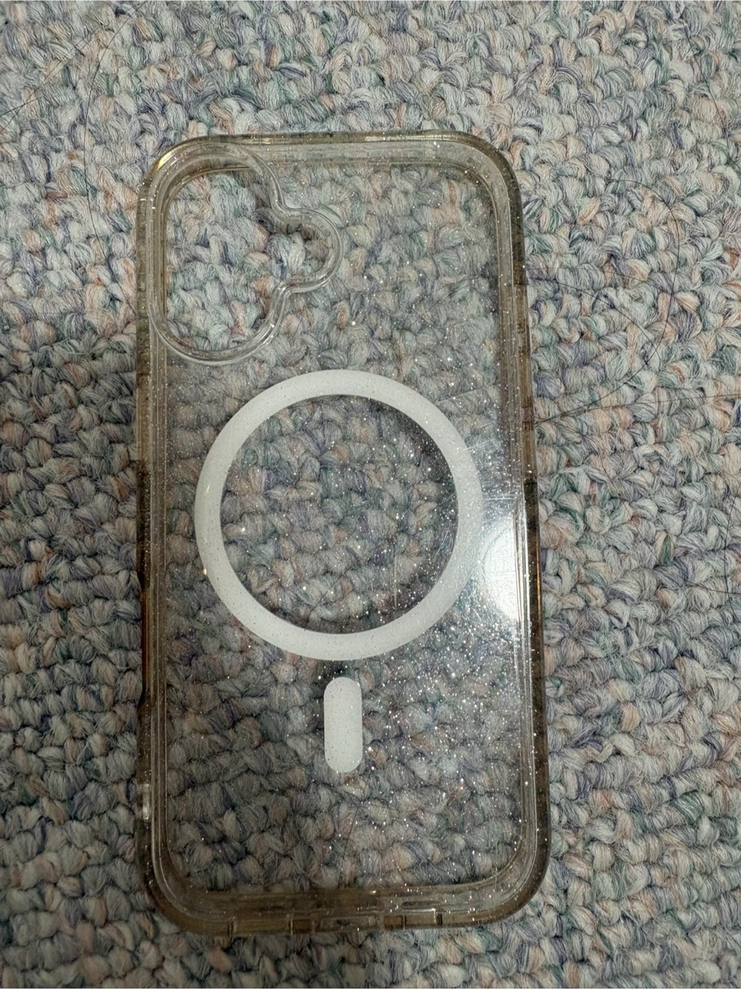 This is a clear phone case with a glitter inlay. It features a MagSafe compatible ring for easy charging and accessory attachment. The case is made from a durable, transparent material.