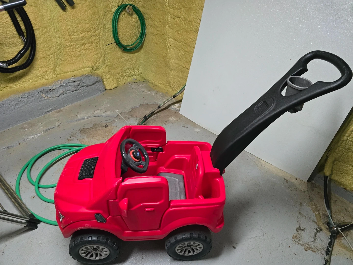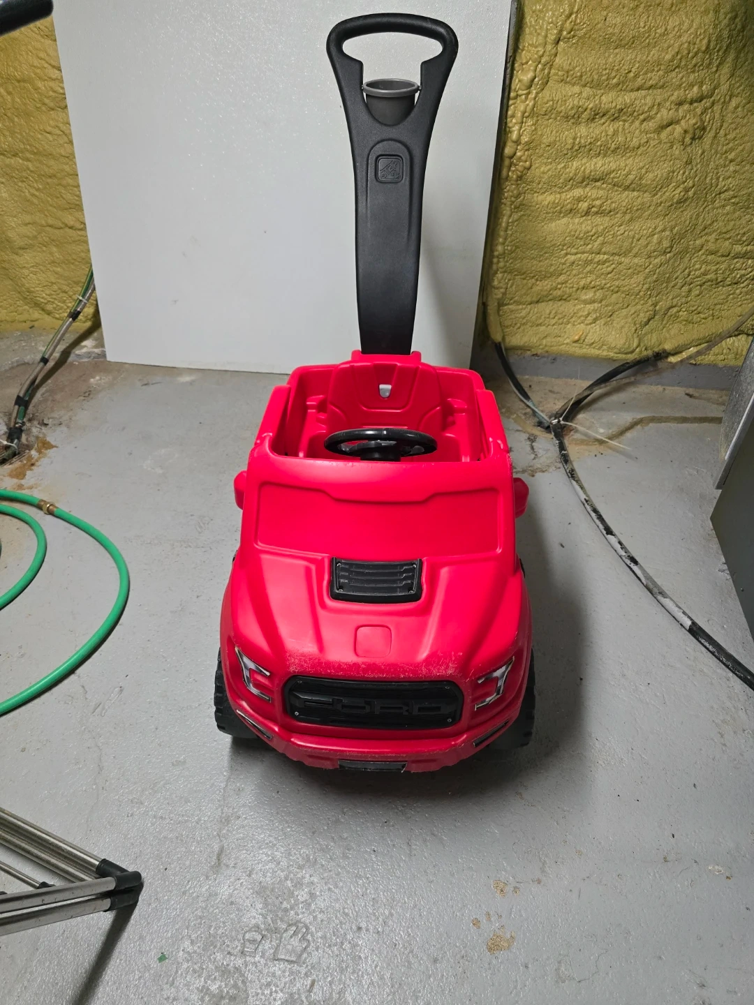 This red ride-on car is designed for little ones. It features a steering wheel and a sturdy push handle for adult control. Plastic construction.