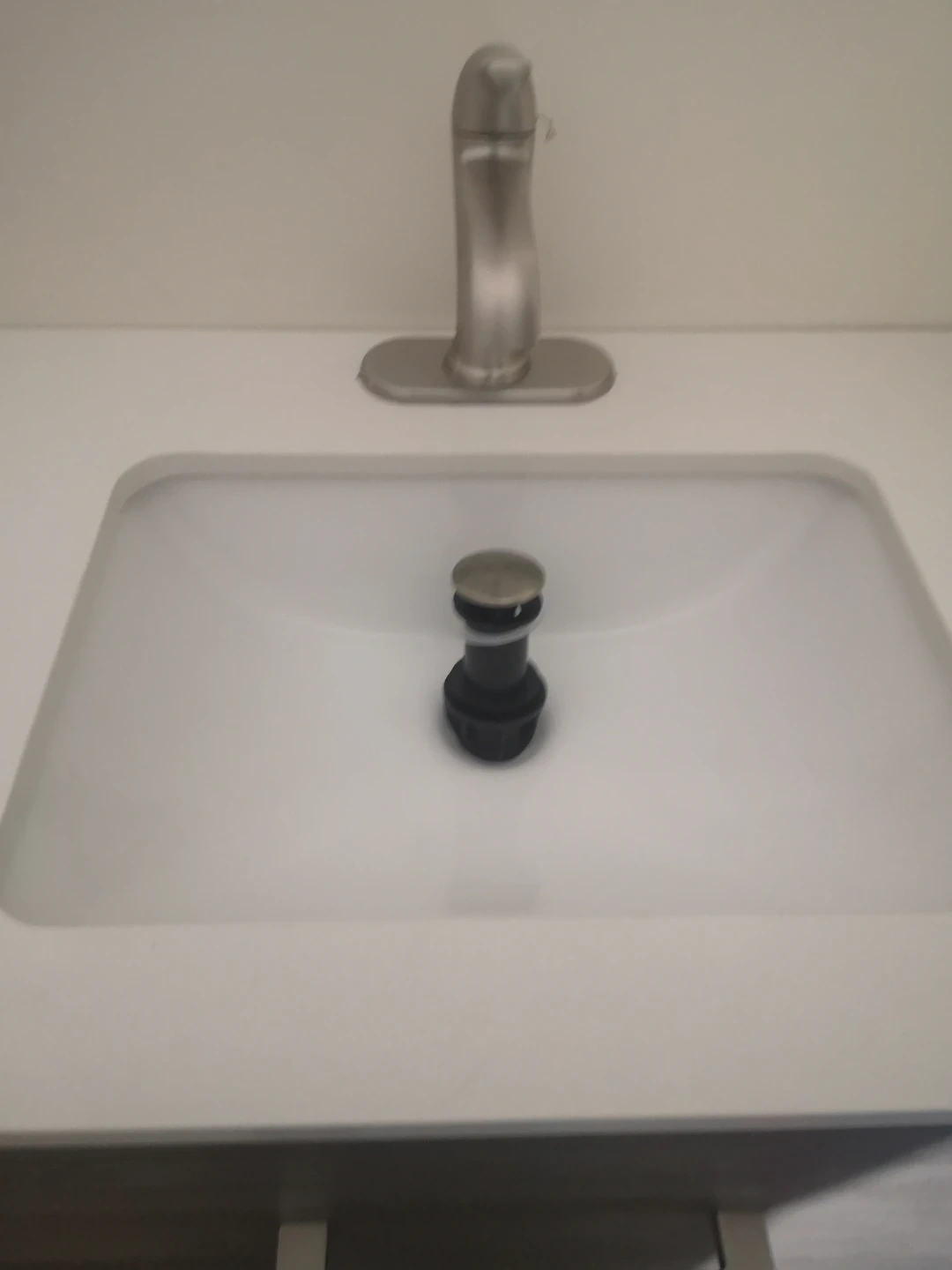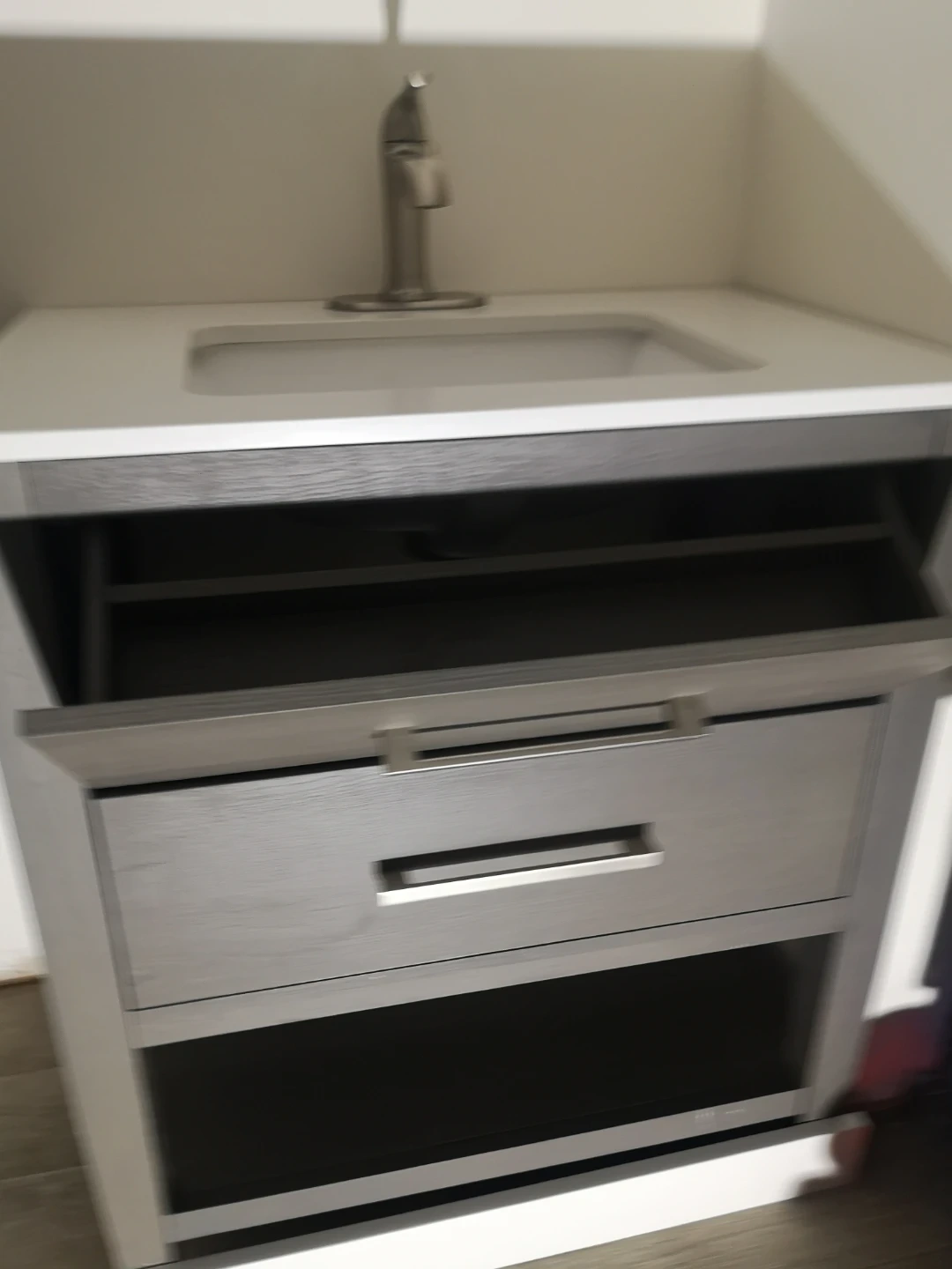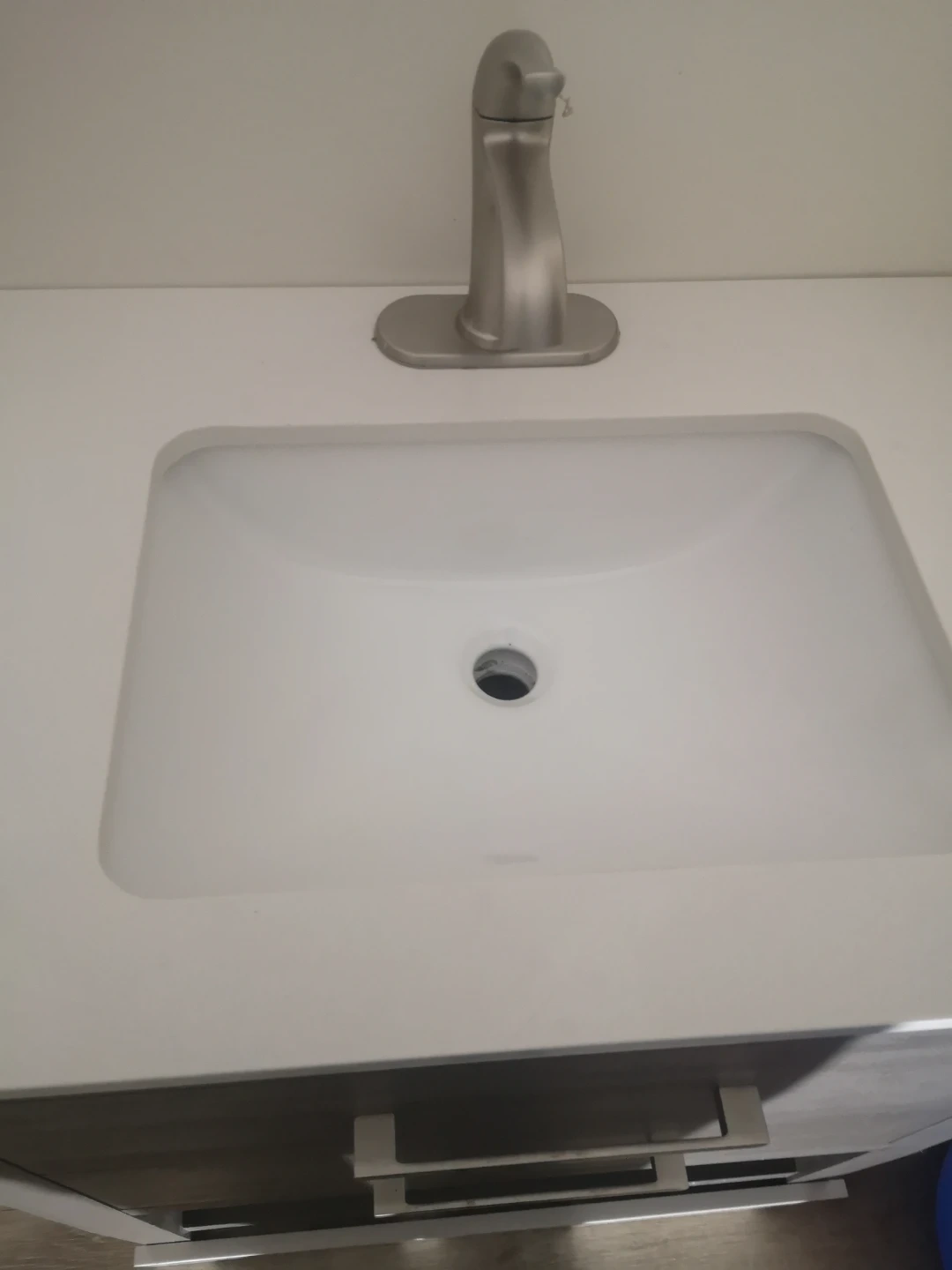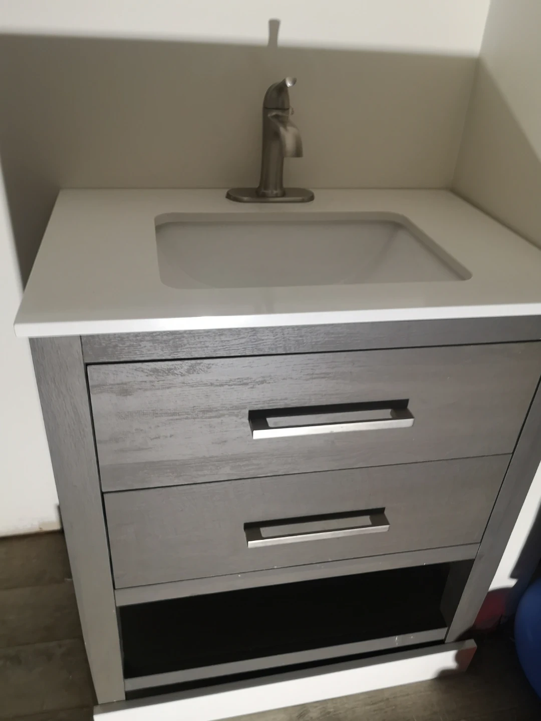 This is a modern bathroom vanity. It features two drawers and an open shelf for storage. The countertop is white and includes a stainless steel faucet. This unit would be great for a small bathroom or powder room. Brand new never used paid $350 asking $200 OBO!