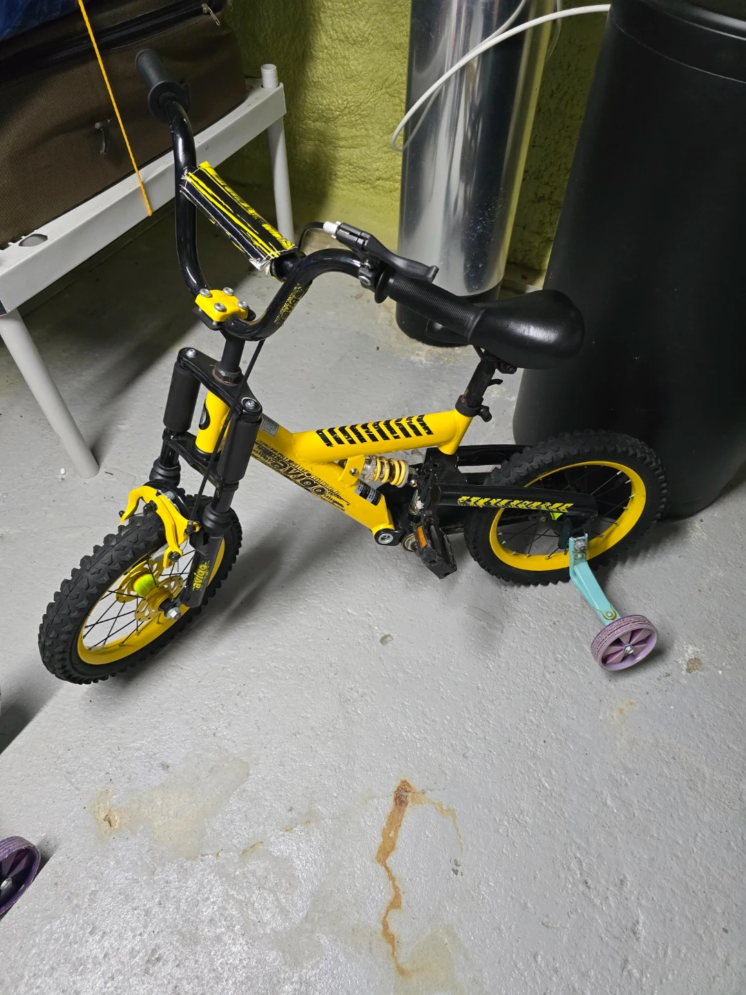This is a yellow kids' bicycle with training wheels. It has a durable frame and is great for learning to ride. Training wheels are included.