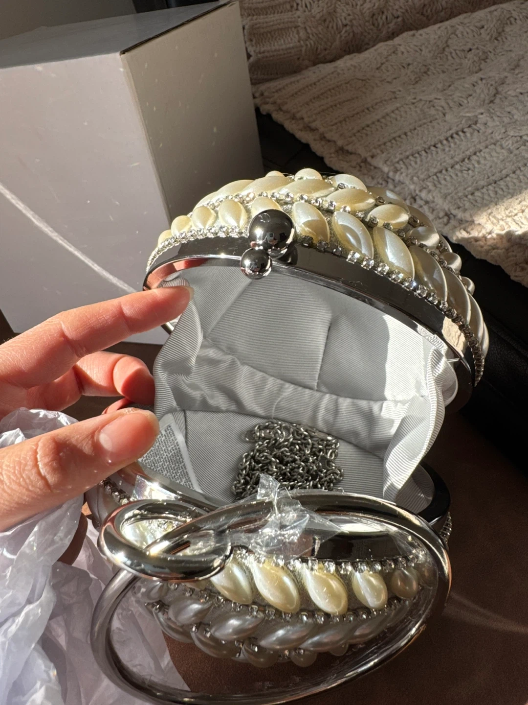 This eye-catching round clutch bag is adorned with faux pearls and sparkling rhinestones in a beautiful floral pattern. It features a silver-tone clasp and a delicate silver chain for easy carrying. Comes with its original box.