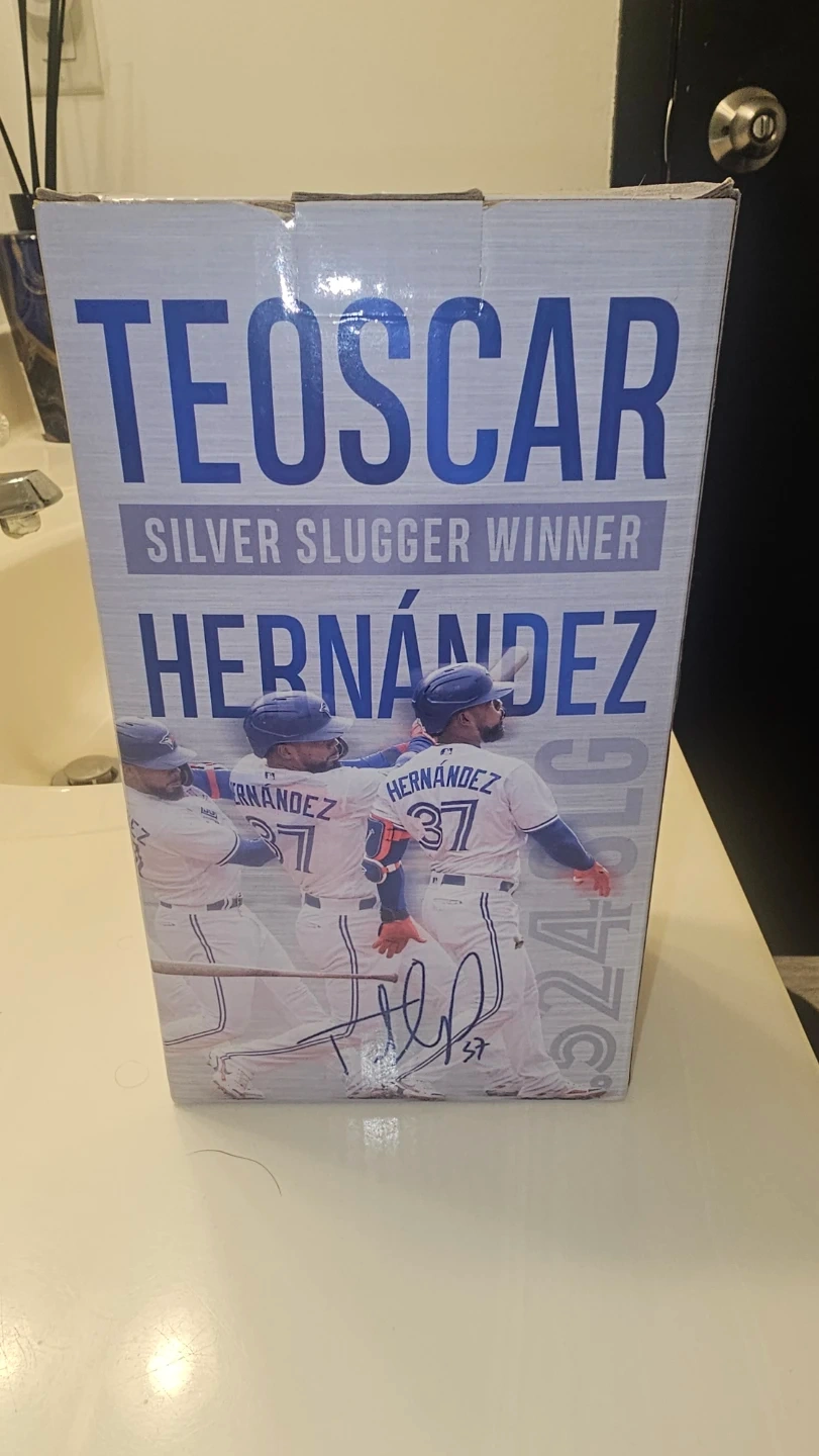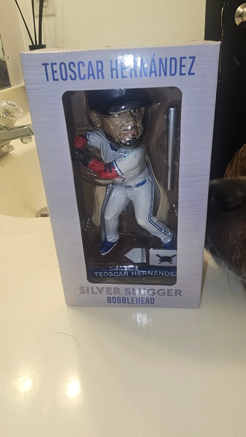 This is a Teoscar Hernández Silver Slugger bobblehead. It commemorates his 32 home runs, 116 RBI, and 163 hits. This collectible would be great for any baseball fan!