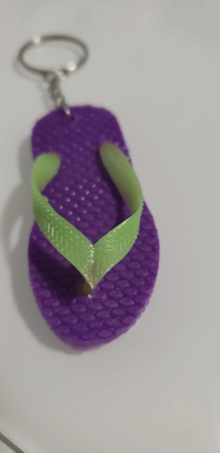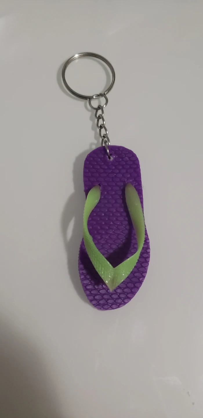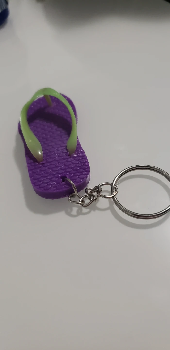 A fun keychain designed like a mini purple flip flop with lime green straps. It's made of plastic and metal. It's a neat little accessory for your keys, especially if you like the beach!