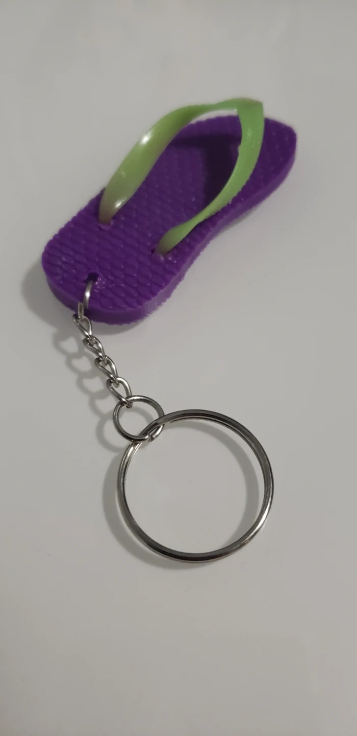 A fun keychain designed like a mini purple flip flop with lime green straps. It's made of plastic and metal. It's a neat little accessory for your keys, especially if you like the beach!