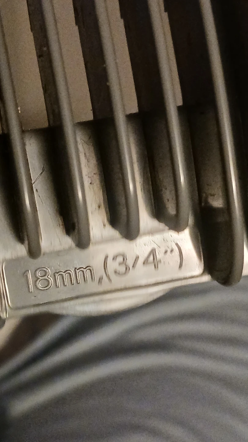 Set includes various hair clipper attachment guards, including a right & left taper guard. One guard is labelled 18mm (3/4"). Also includes a small cleaning brush. These are likely replacement parts for a hair clipper set.
