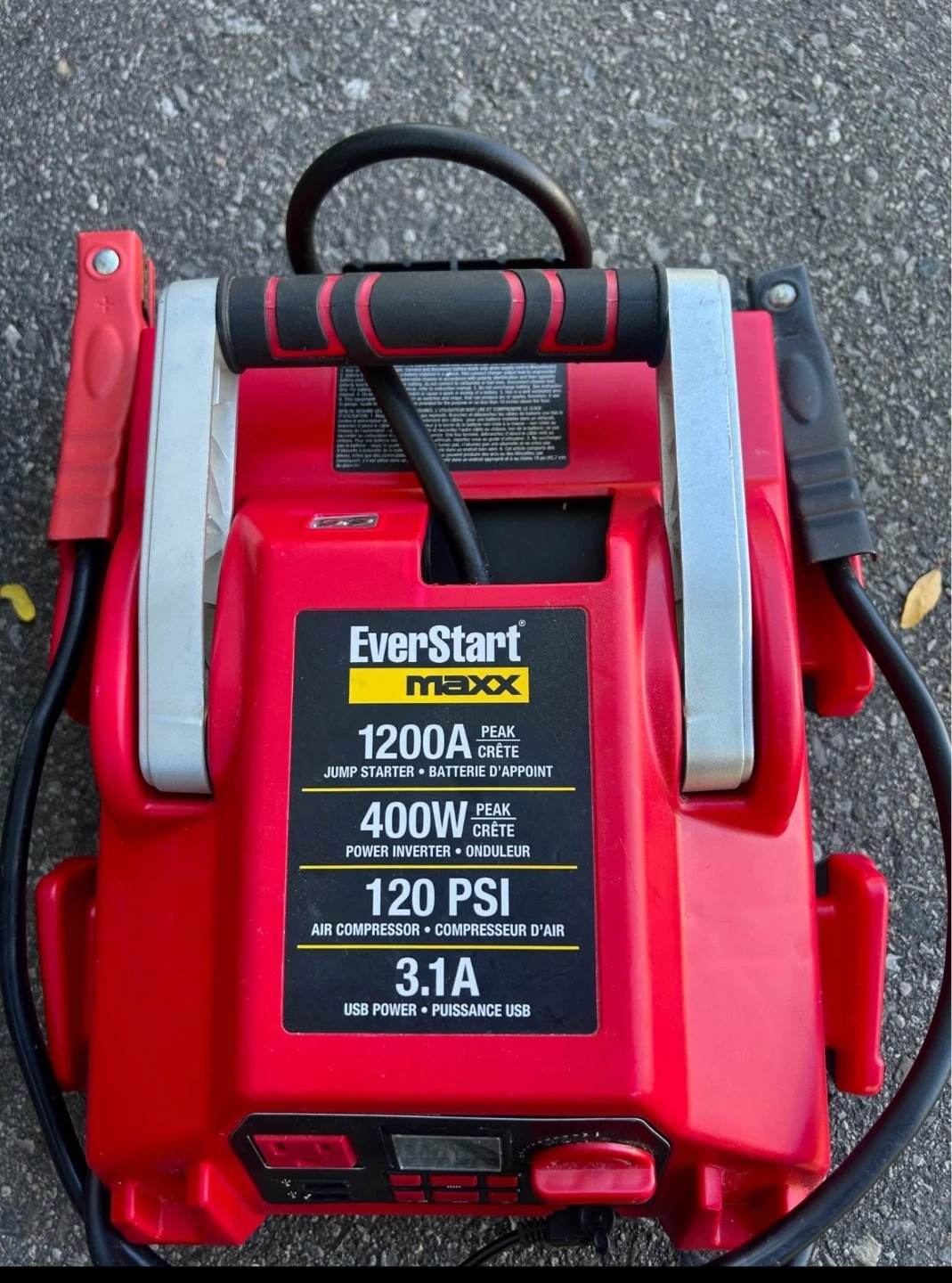 This EverStart Maxx jump starter offers 1200 peak amps for starting vehicles. It also features a 400W power inverter and a 120 PSI air compressor. Includes 3.1A USB power.