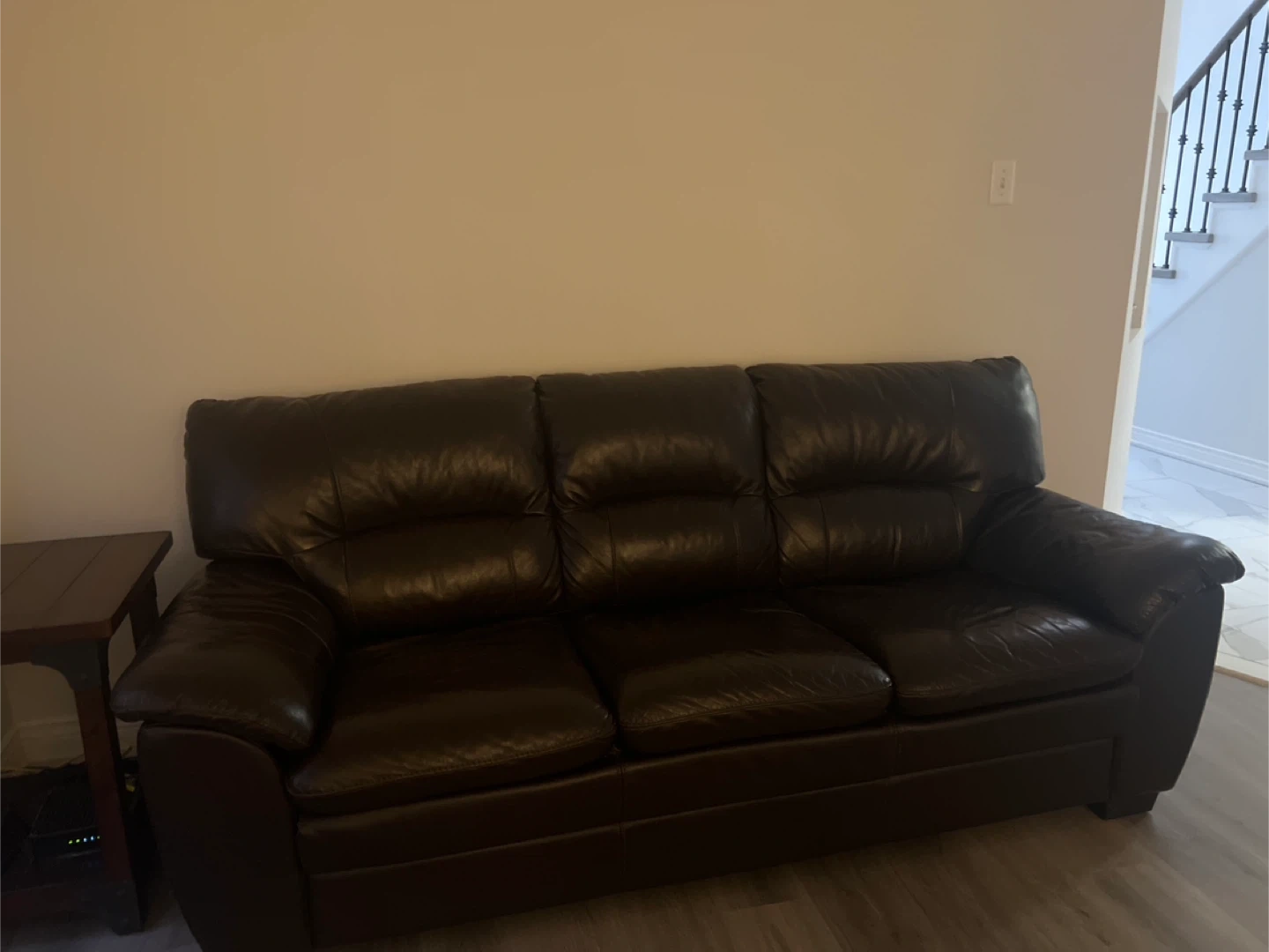 A spacious dark brown leather sofa with three cushions. This sofa has a classic design and is upholstered in genuine leather. It offers ample seating for a family or guests. It's a comfortable addition to any living room!