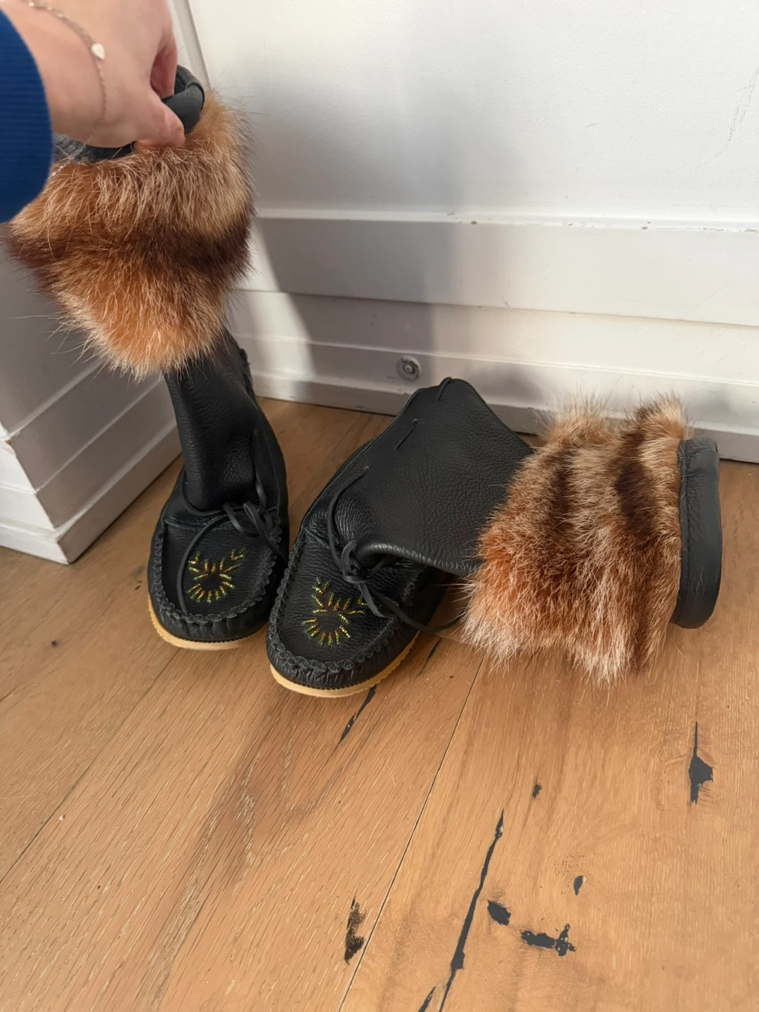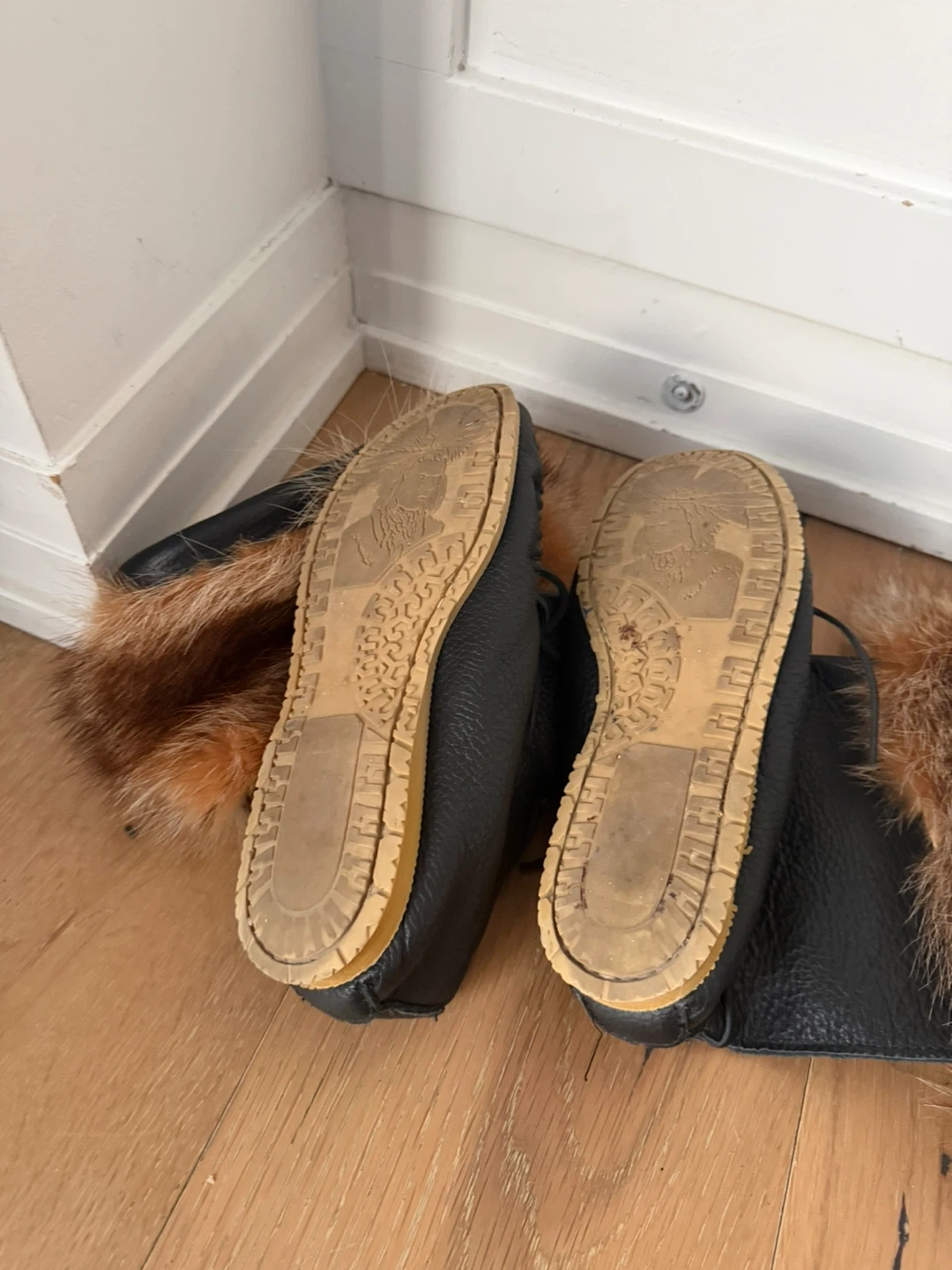 Black leather moccasin boots featuring a decorative stitched pattern on the toe and a real fur trim. They have a durable rubber sole. These boots are cozy and stylish for cooler weather. Gently used.