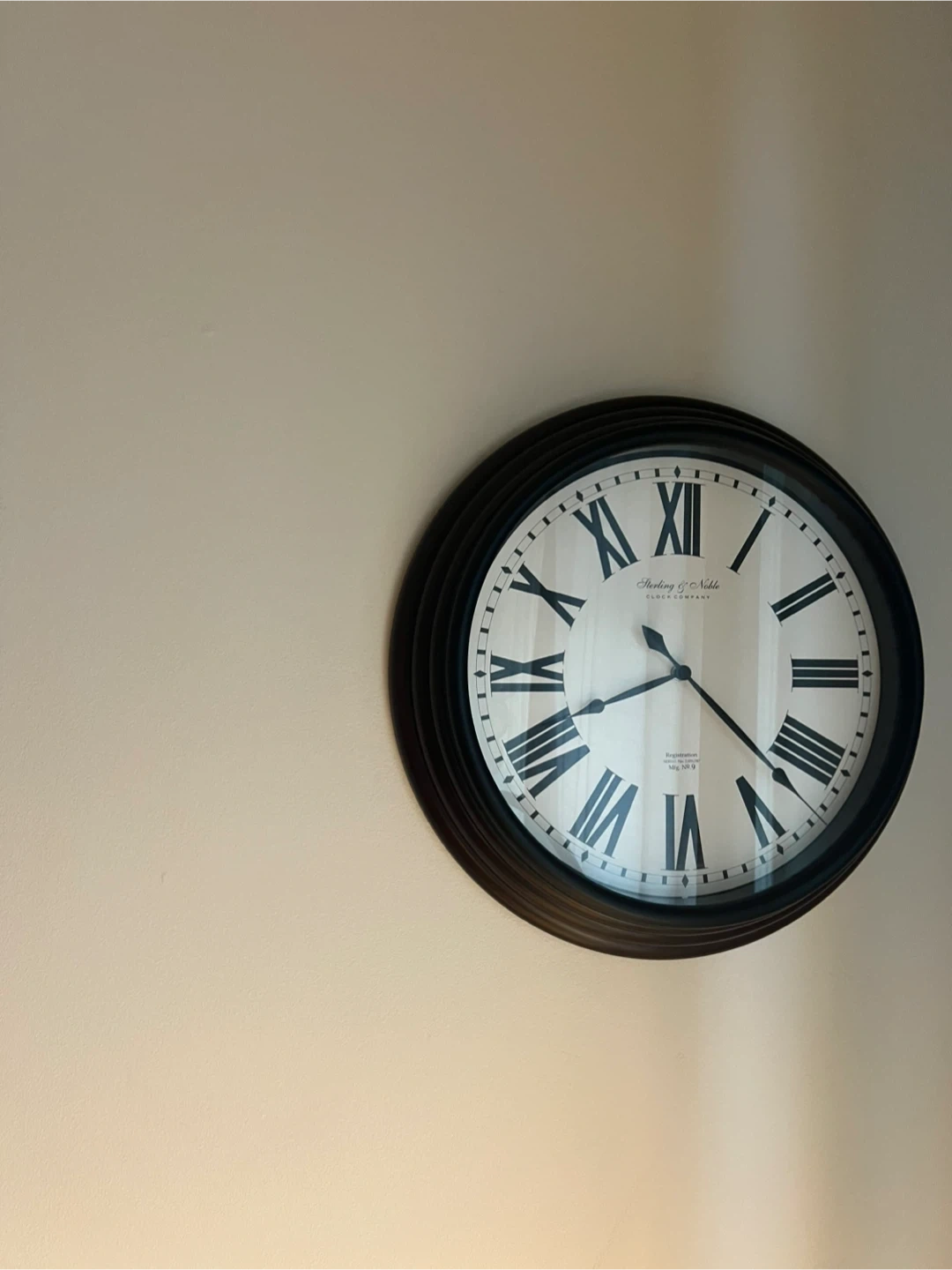 This is a Sterling & Noble wall clock with a classic Roman numeral design. It features a black frame and a light-coloured face. The clock has analog hands for hours and minutes.