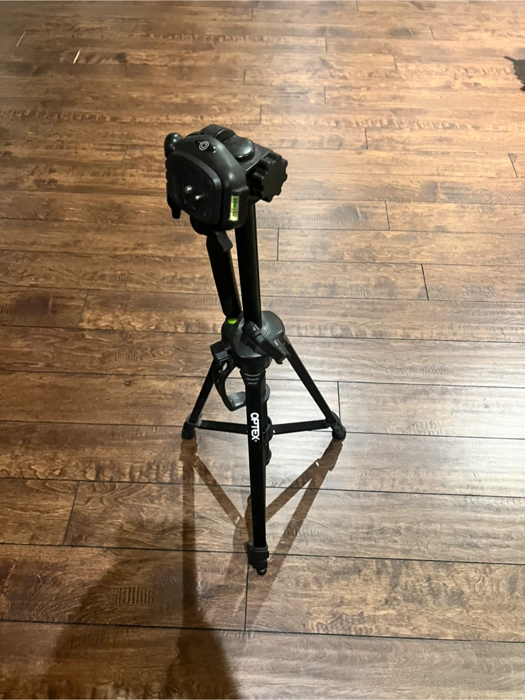 This is a black Optex tripod. It's made of metal for durability. This tripod is useful for photographers and videographers needing a stable base for their equipment.