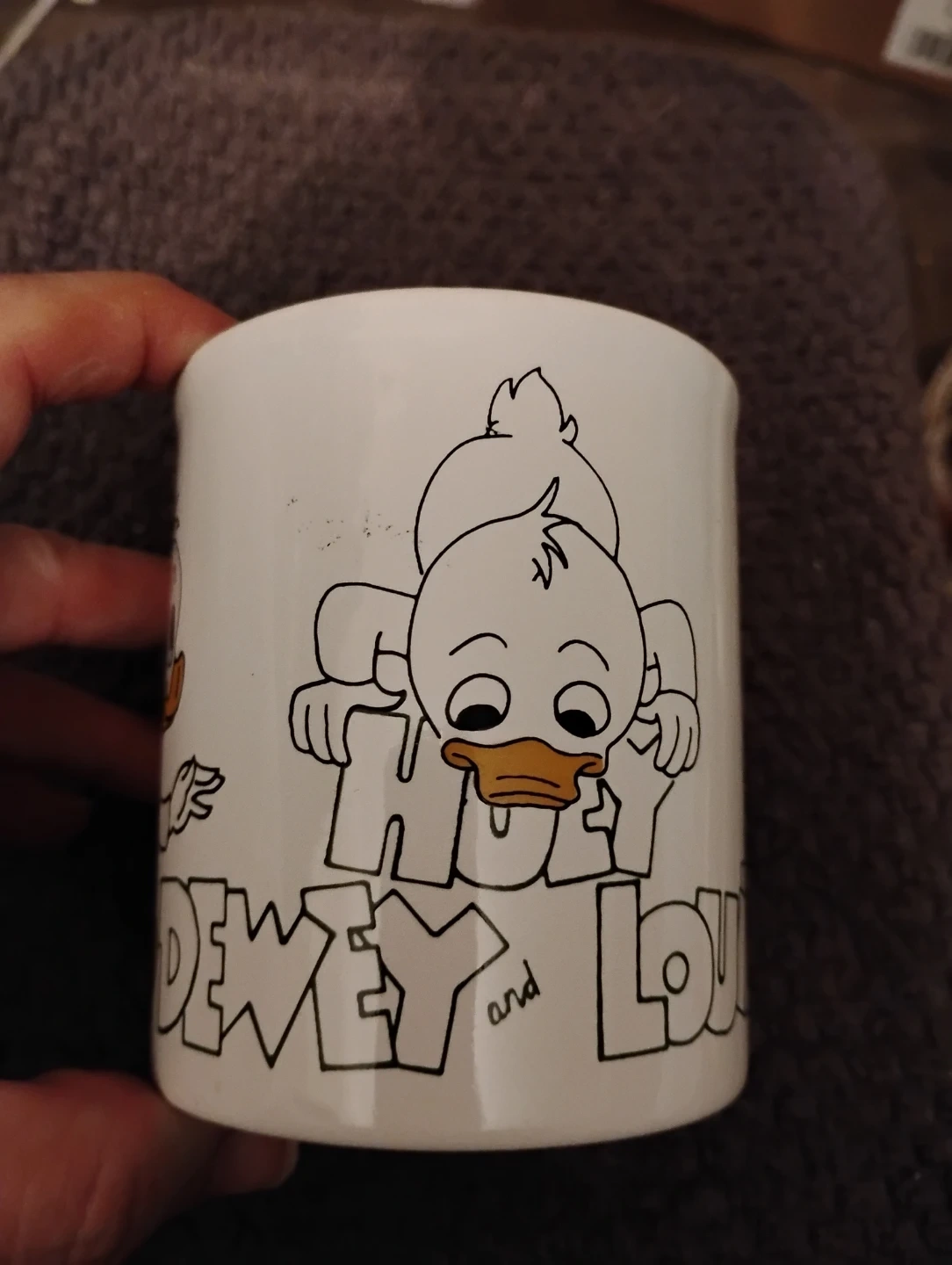 VINTAGE!! DISNEY'S HUEY, DEWEY & LOUIE MCDUCK MUG. HAS BEEN USED, THERE ARE A FEW STIR MARKS ON THE BOTTOM FROM A METAL SPOON. NO STAINS, CRACKS OR CHIPS.
