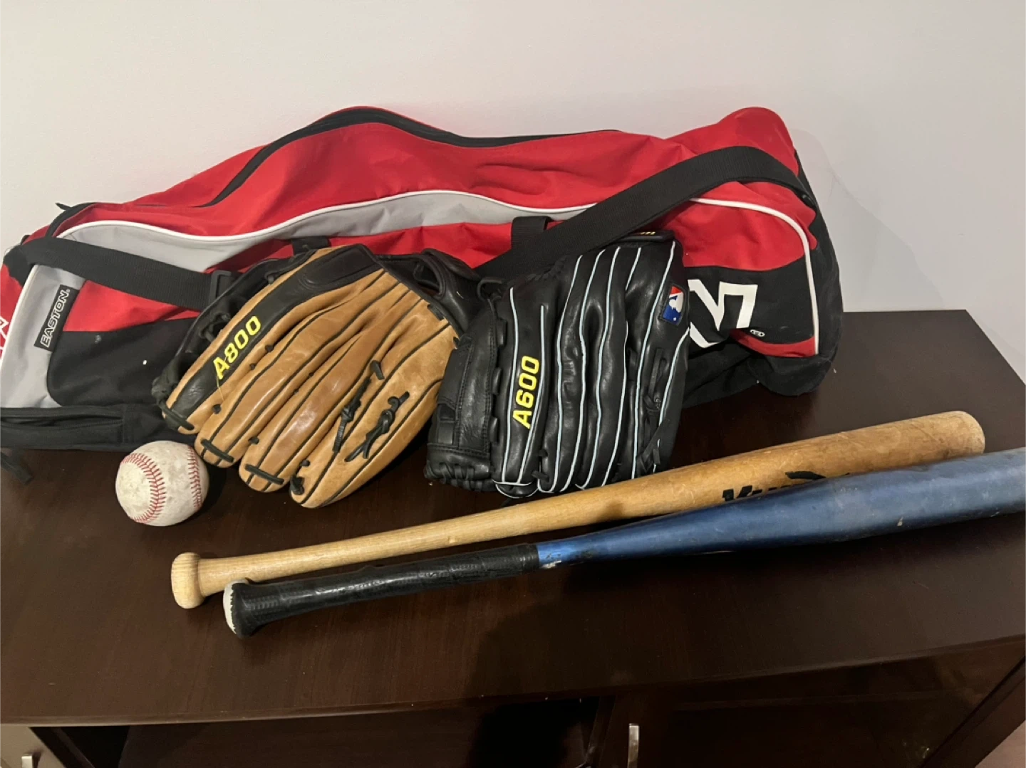 This baseball set includes a large red and black Easton duffel bag, two baseball mitts (one tan, one black, both marked A800), a baseball, and two bats (one wood, one blue metal). It's a good collection for starting out in baseball!