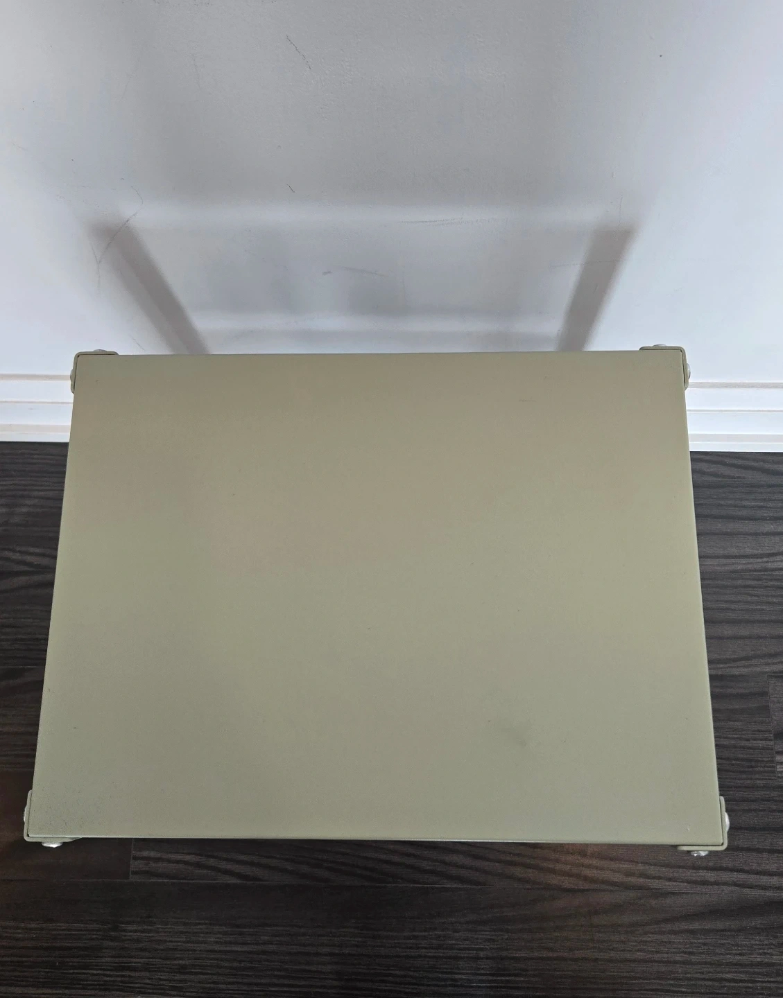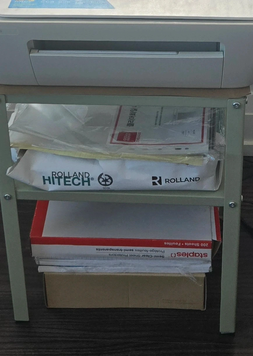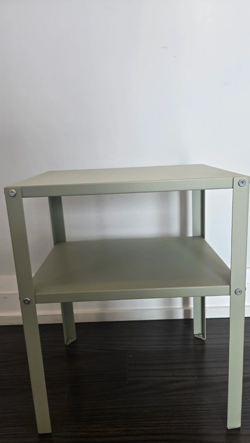 This sturdy metal side table features two shelves, perfect for holding your printer and office supplies. It's a practical addition to any workspace or home office. Its simple design makes it easy to place anywhere!