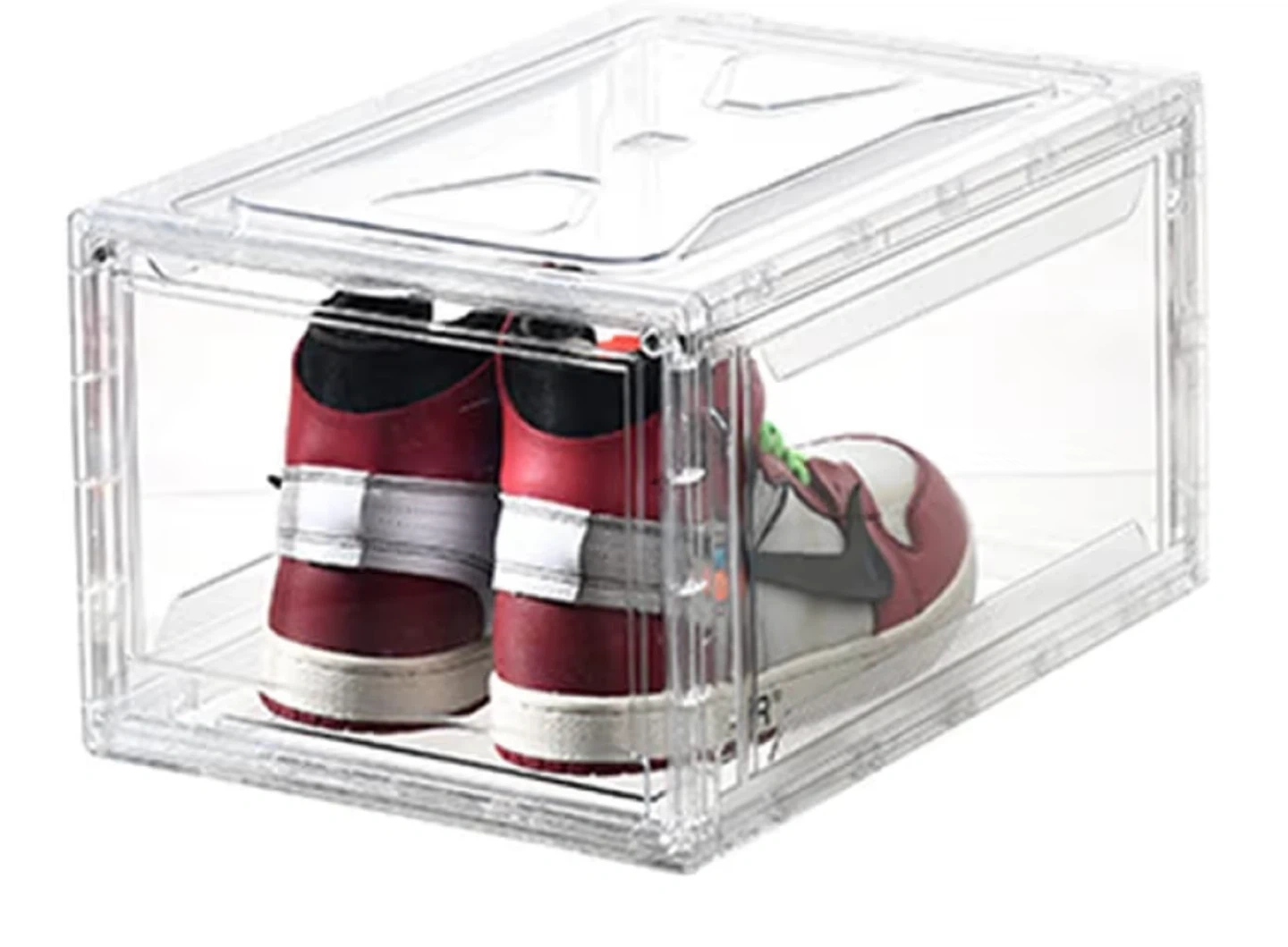 Set of clear, stackable storage boxes. These boxes are perfect for organizing shoes or other small items. They're made of durable plastic. Each box has a front-opening door for easy access.