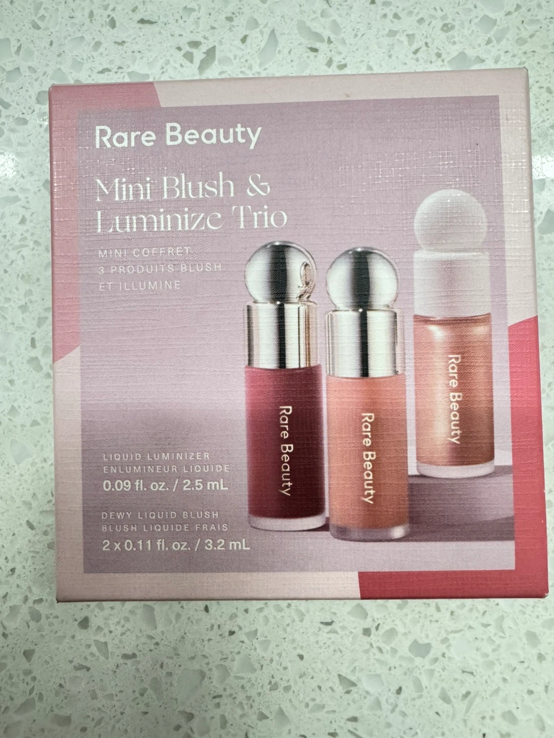 Rare Beauty Mini Blush & Luminize Trio includes one liquid luminizer at 0.09 fl. oz. / 2.5 mL. It also comes with two dewy liquid blushes, each 0.11 fl. oz. / 3.2 mL. This set is perfect for trying out different shades.