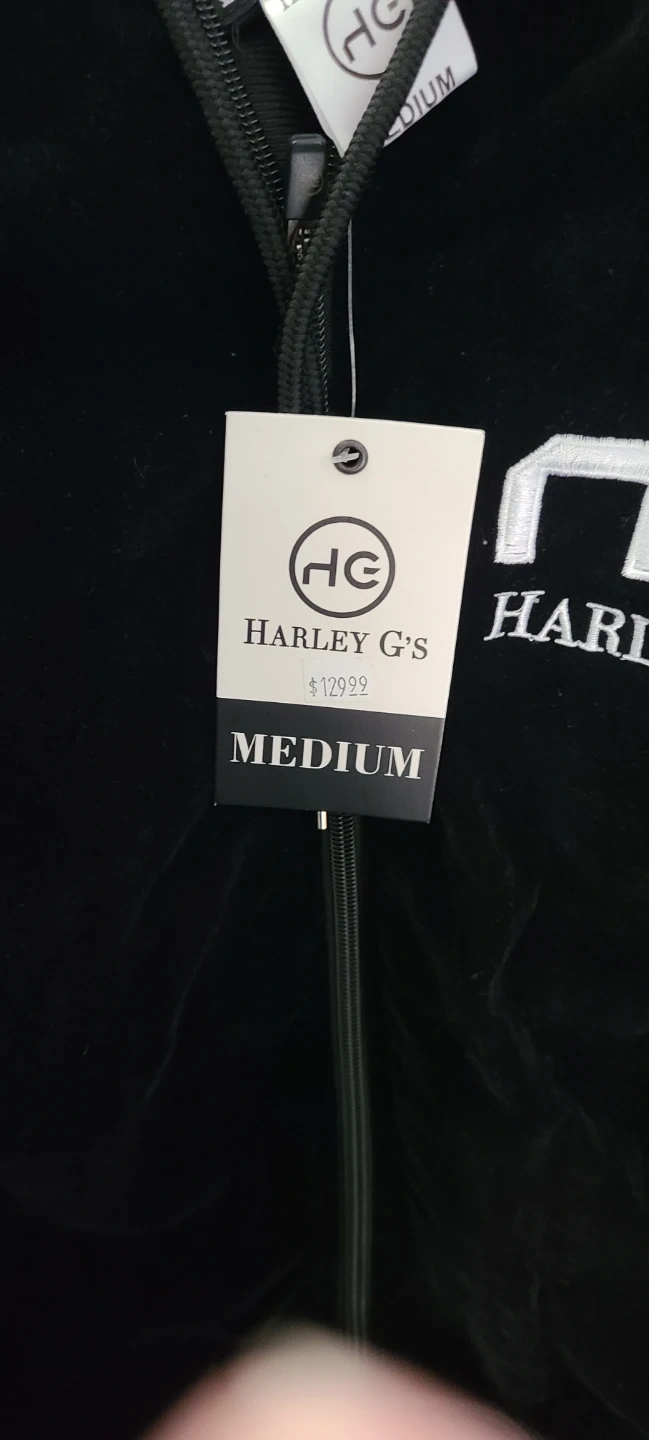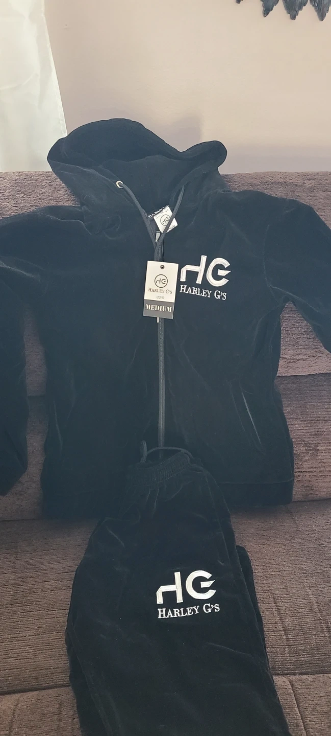 This is a Harley G's velour tracksuit set. It includes a zip-up hoodie and matching bottoms. The set is black and size medium. It's made of soft velour material.