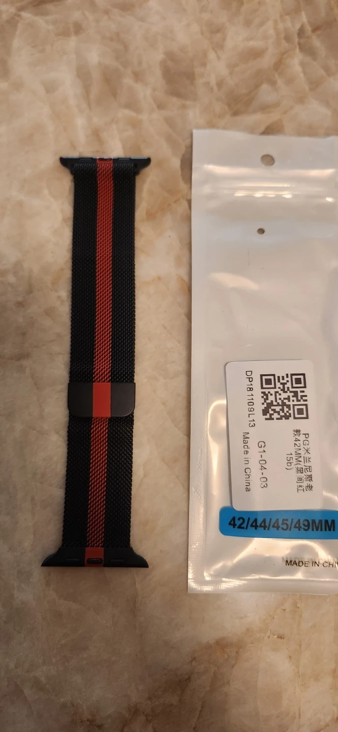 A black and red Milanese loop watch band for Apple Watch. It's compatible with 42, 44, 45, and 49mm watch sizes. This band is made of stainless steel mesh with a magnetic closure. It's a stylish and comfortable option for your Apple Watch!