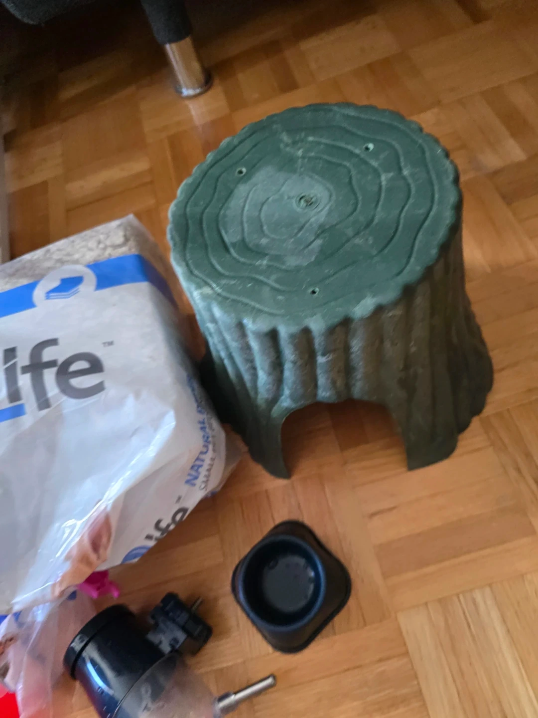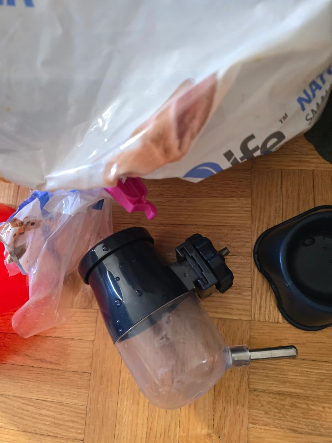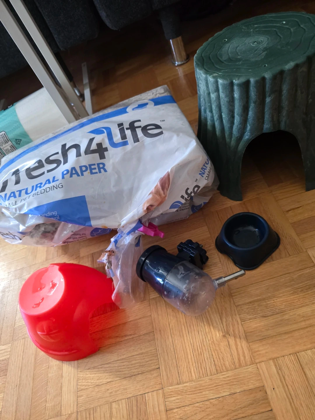 Bag of Fresh4Life Natural Paper small pet bedding. Includes a red food bowl, a green tree hideout, and a water bottle dispenser. Ideal for rabbits, guinea pigs, hamsters, gerbils, rats, mice, ferrets, and other small pets.