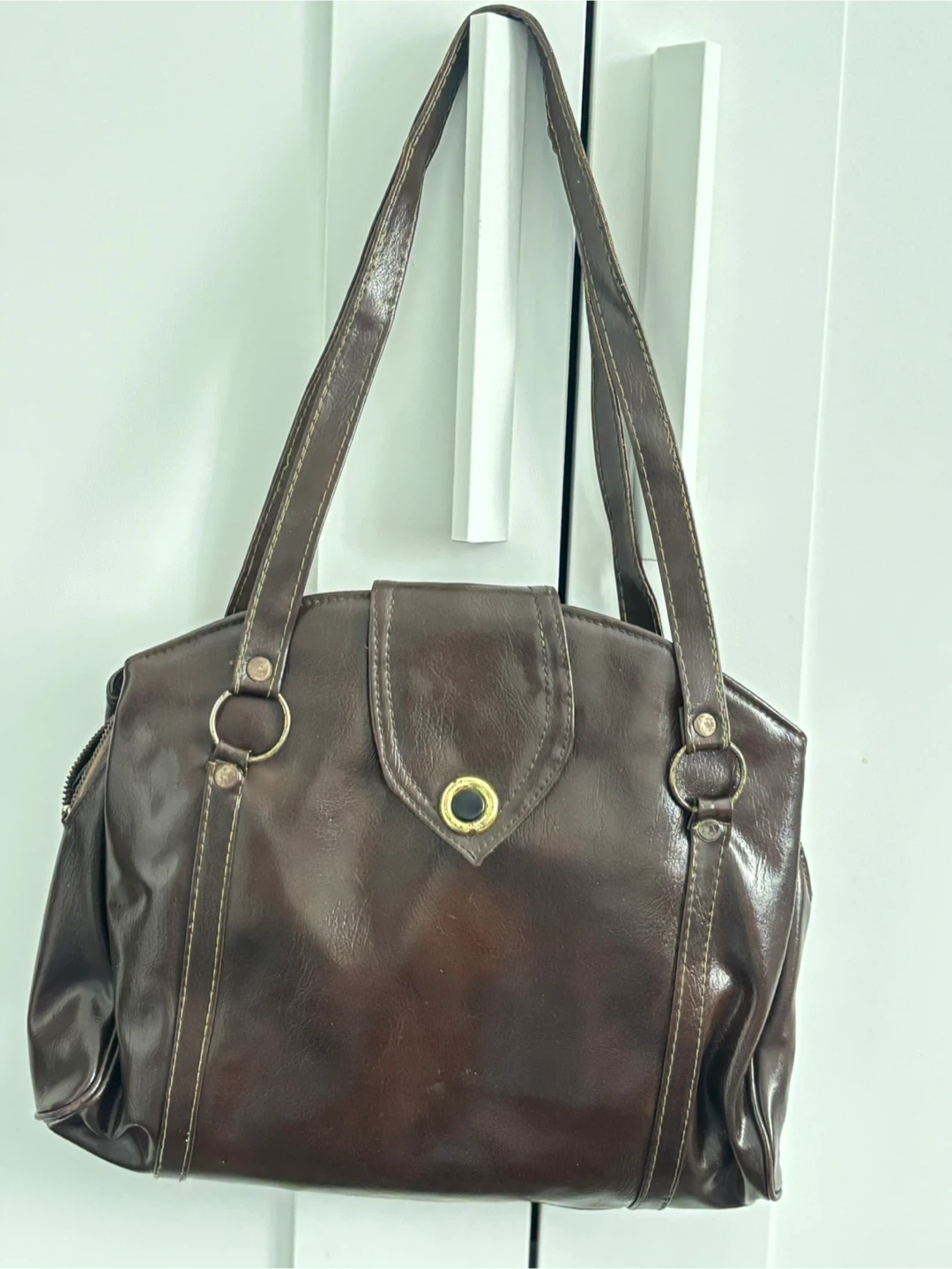 This stylish shoulder bag is made of dark brown faux leather. It features a top flap closure with a decorative gold-tone button. The bag has dual shoulder straps and a zippered side pocket.