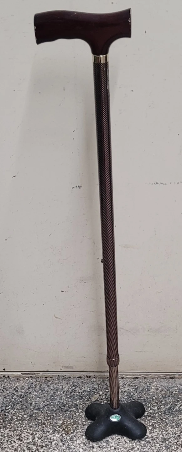 This walking stick features a comfortable T-shaped handle and a stable quad base for excellent support. It's designed for adjustable height, making it suitable for various users. Offers reliable mobility assistance.