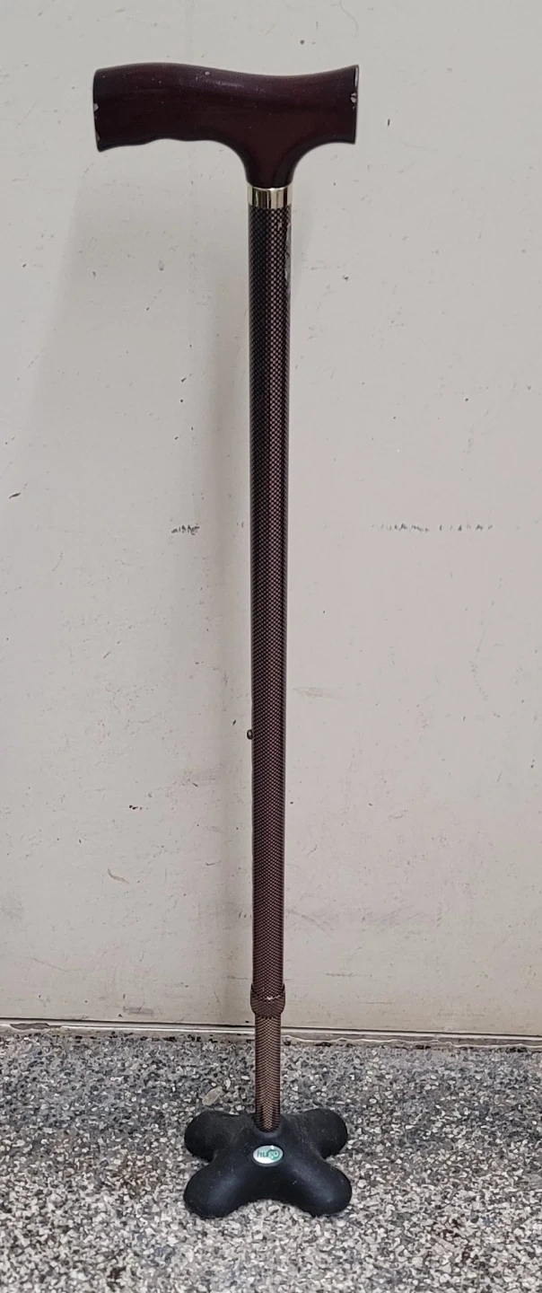 This walking stick features a comfortable T-shaped handle and a stable quad base for excellent support. It's designed for adjustable height, making it suitable for various users. Offers reliable mobility assistance.