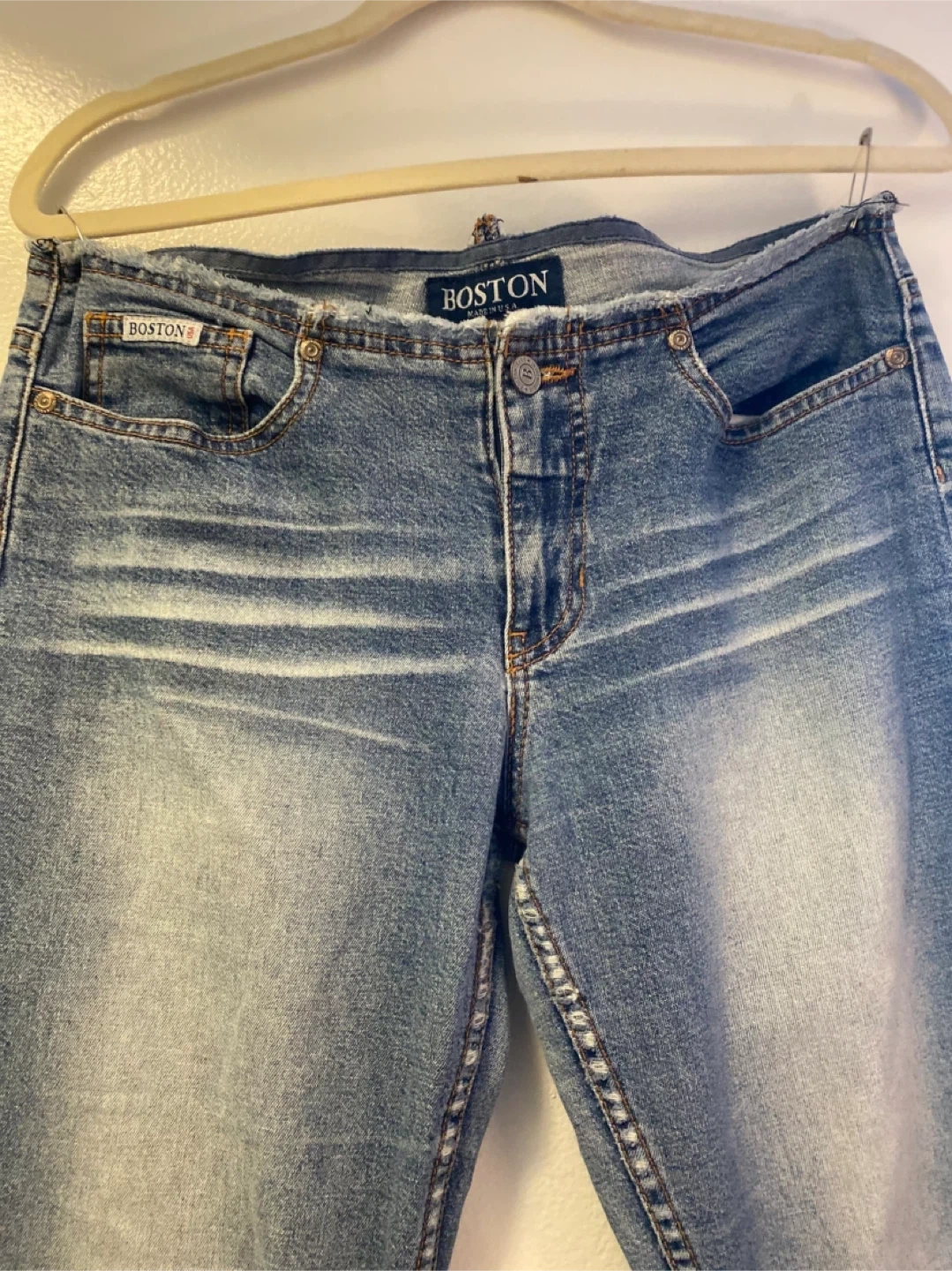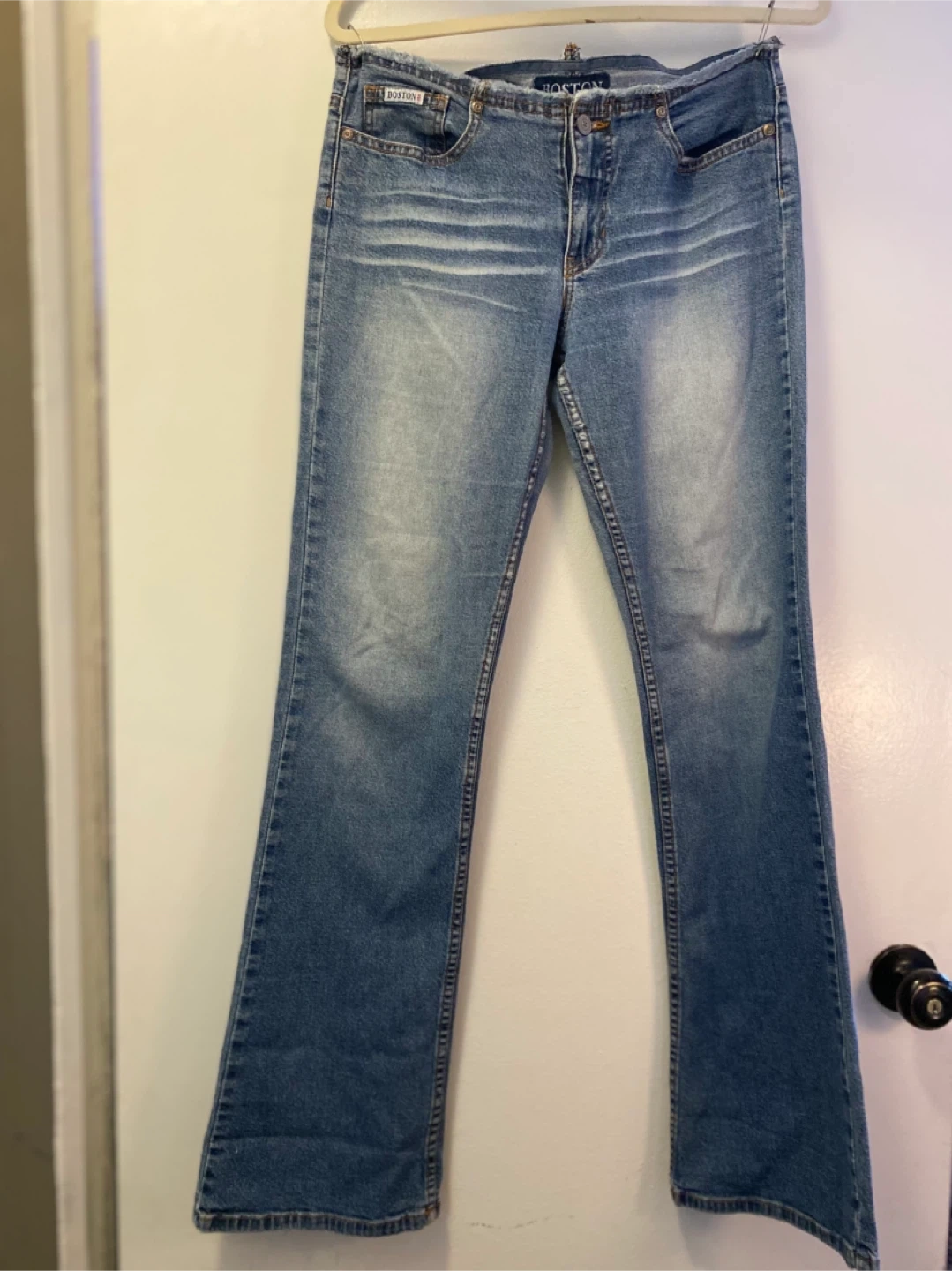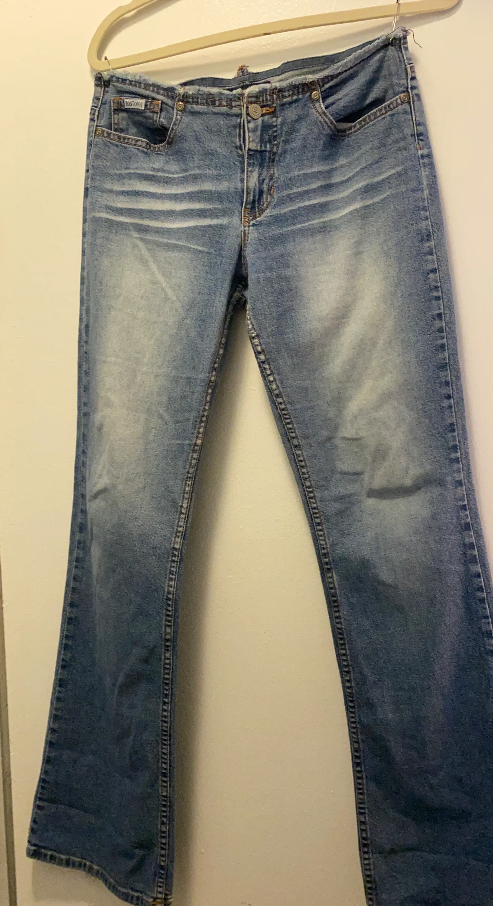 Boston brand women's blue denim jeans. Bootcut style with a faded wash and distressed details. Made in the U.S.A. Size 6. follow me @casa_s_decor ♥️🙏🏻
