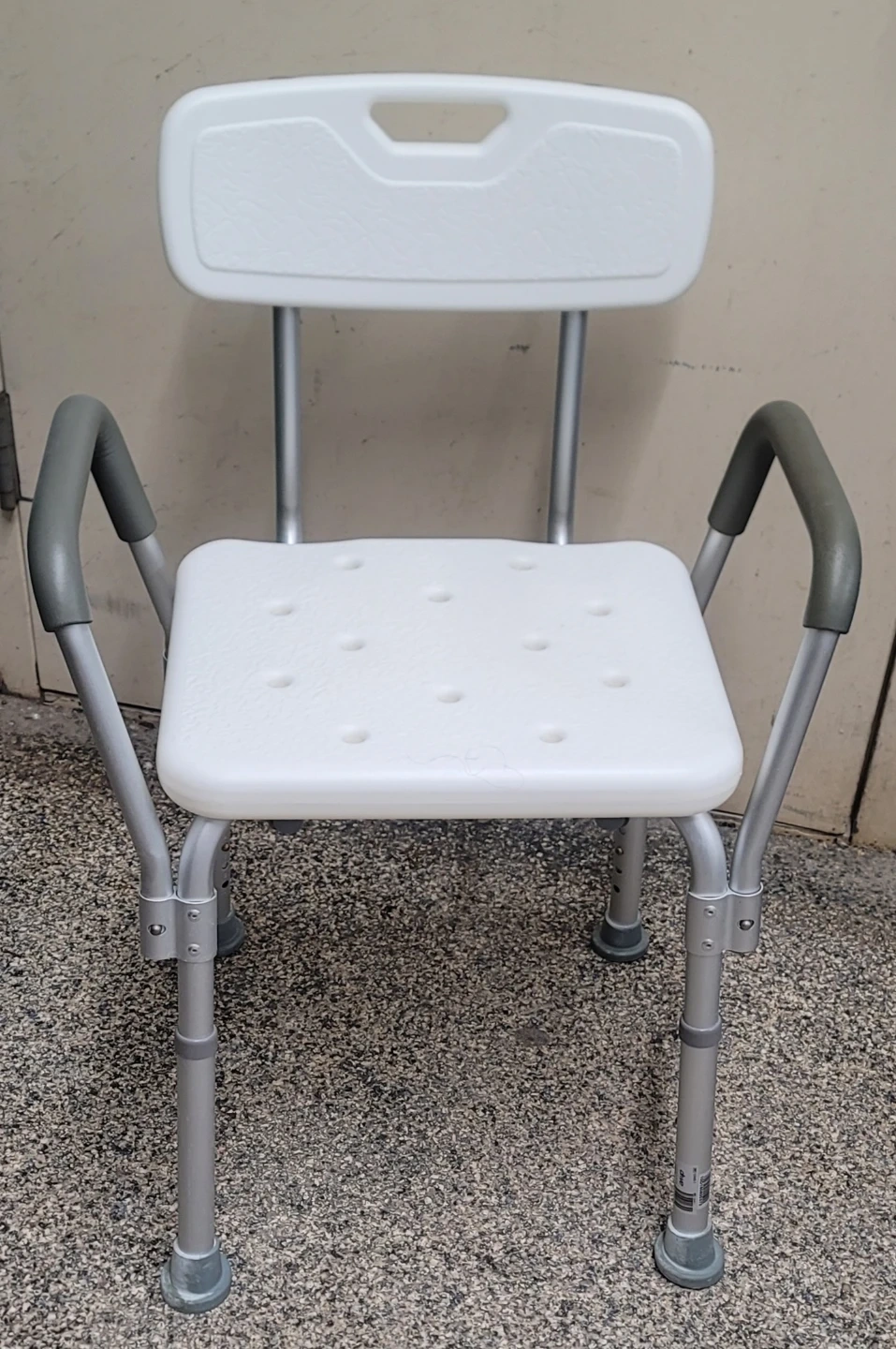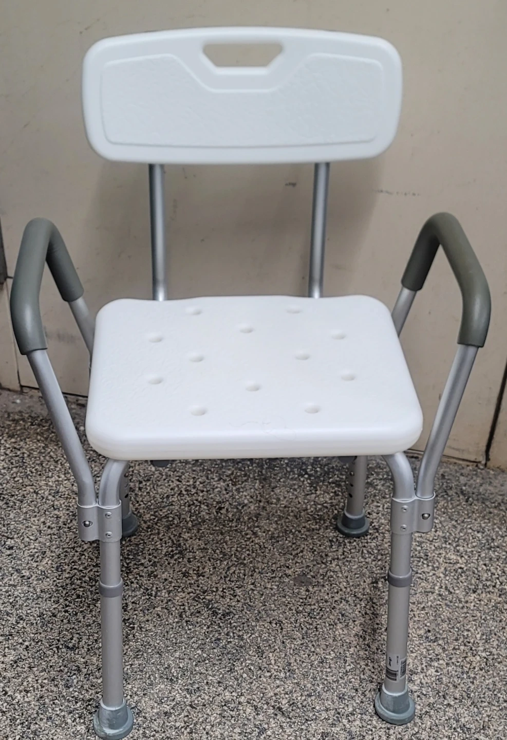 This shower chair offers a safe and comfortable bathing experience. It features a sturdy frame with armrests for added support. The seat has drainage holes to prevent water buildup. Adjustable legs ensure a stable fit in most tub or shower spaces. It's ideal for seniors or those with mobility issues.