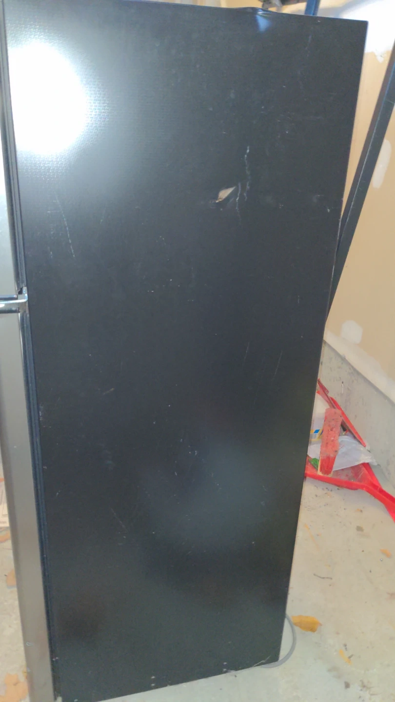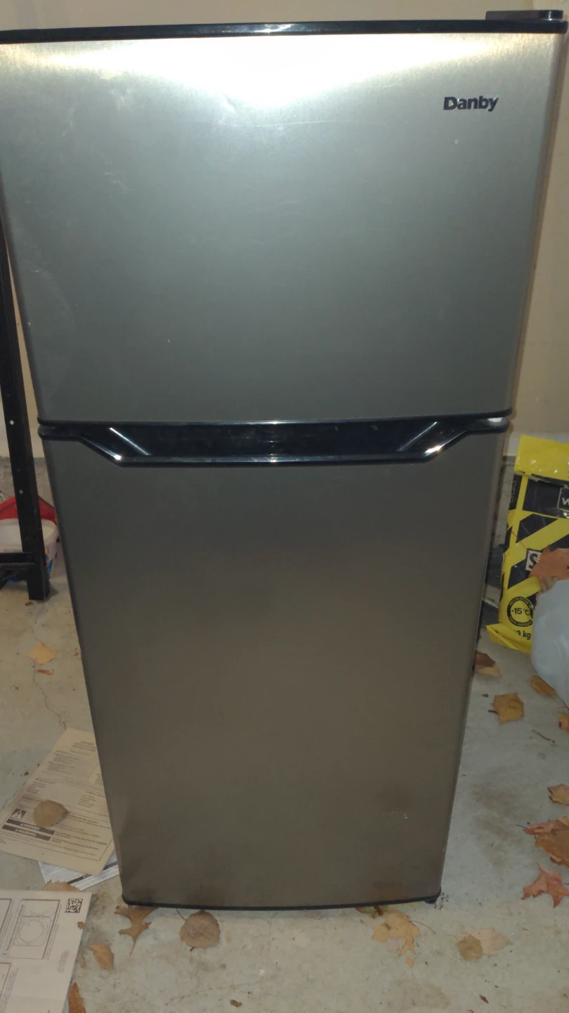 Danby compact refrigerator in a charcoal grey colour. It has two doors and adjustable shelves inside. The exterior shows some minor scuffs. Perfect for small spaces or dorm rooms!