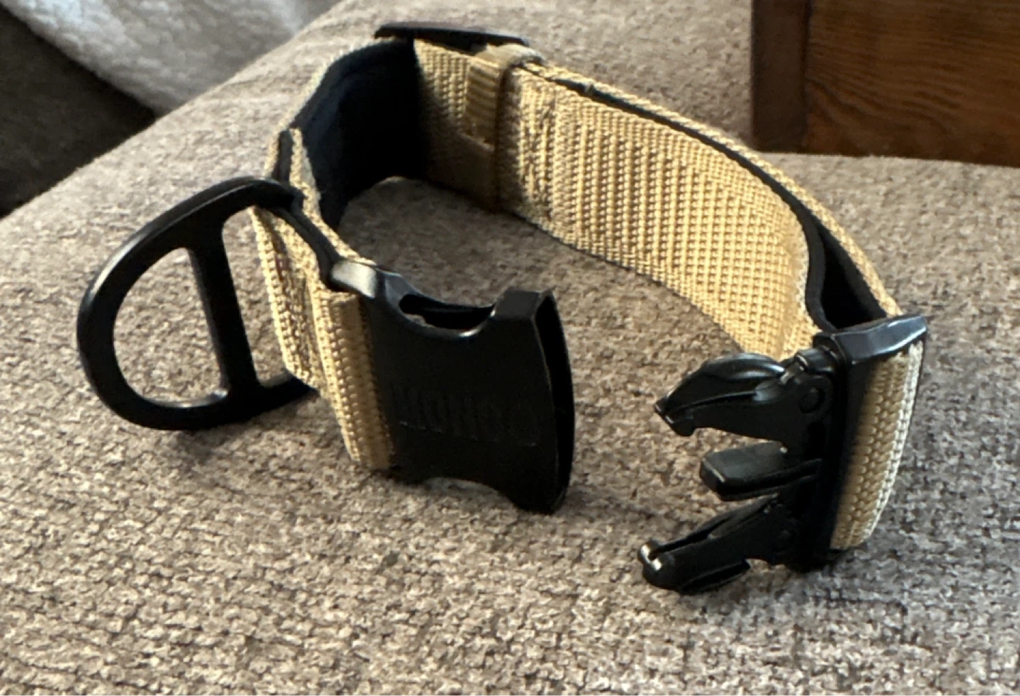 This is a KONG brand dog collar. It's tan with a black buckle and leash attachment. Neck size fits 14-20 inches. Fits dogs weighing 36-55 lbs.