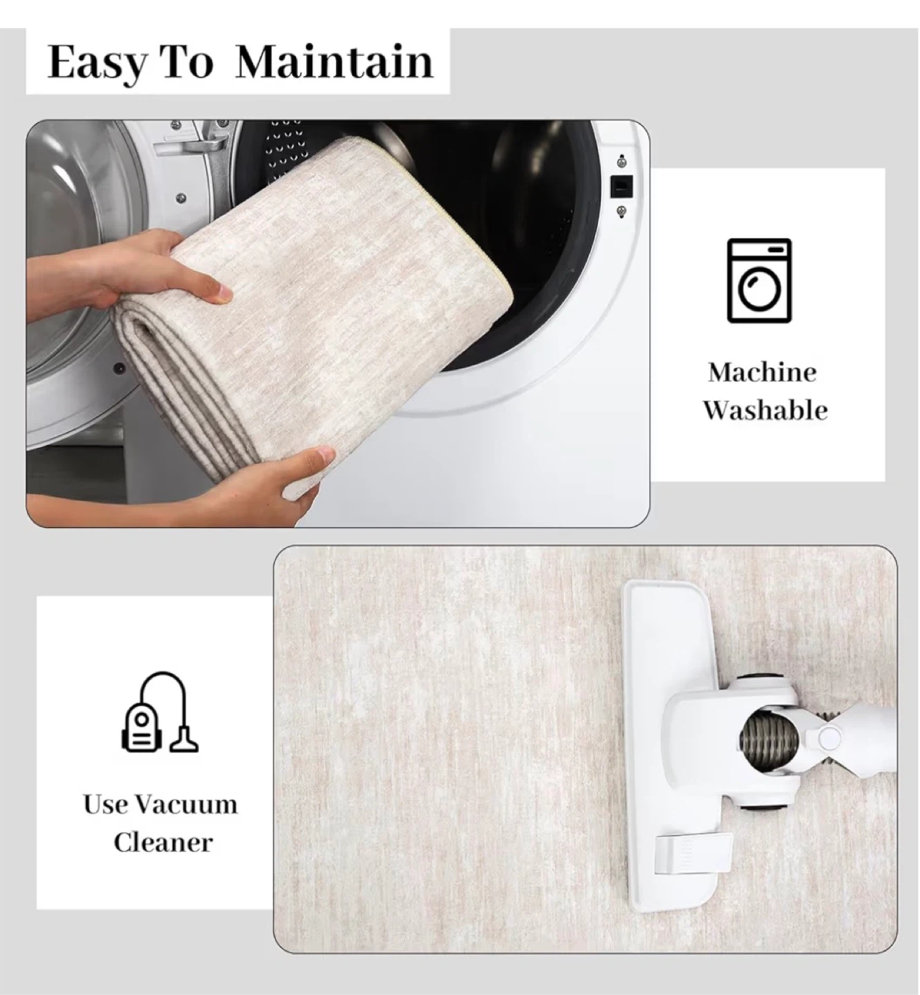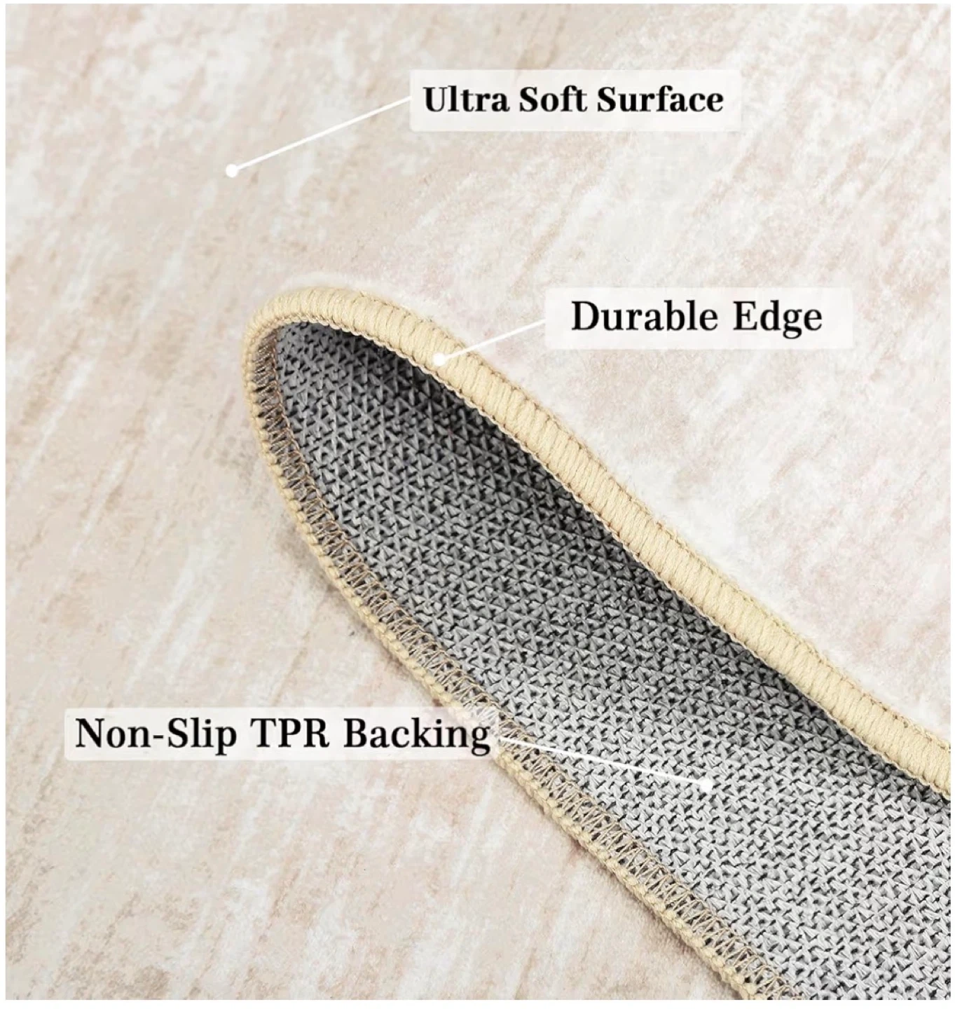 This rug features an ultra-soft surface and a durable edge. It has a non-slip TPR backing, making it safe and stable. It's machine washable and easy to maintain with a vacuum cleaner.
