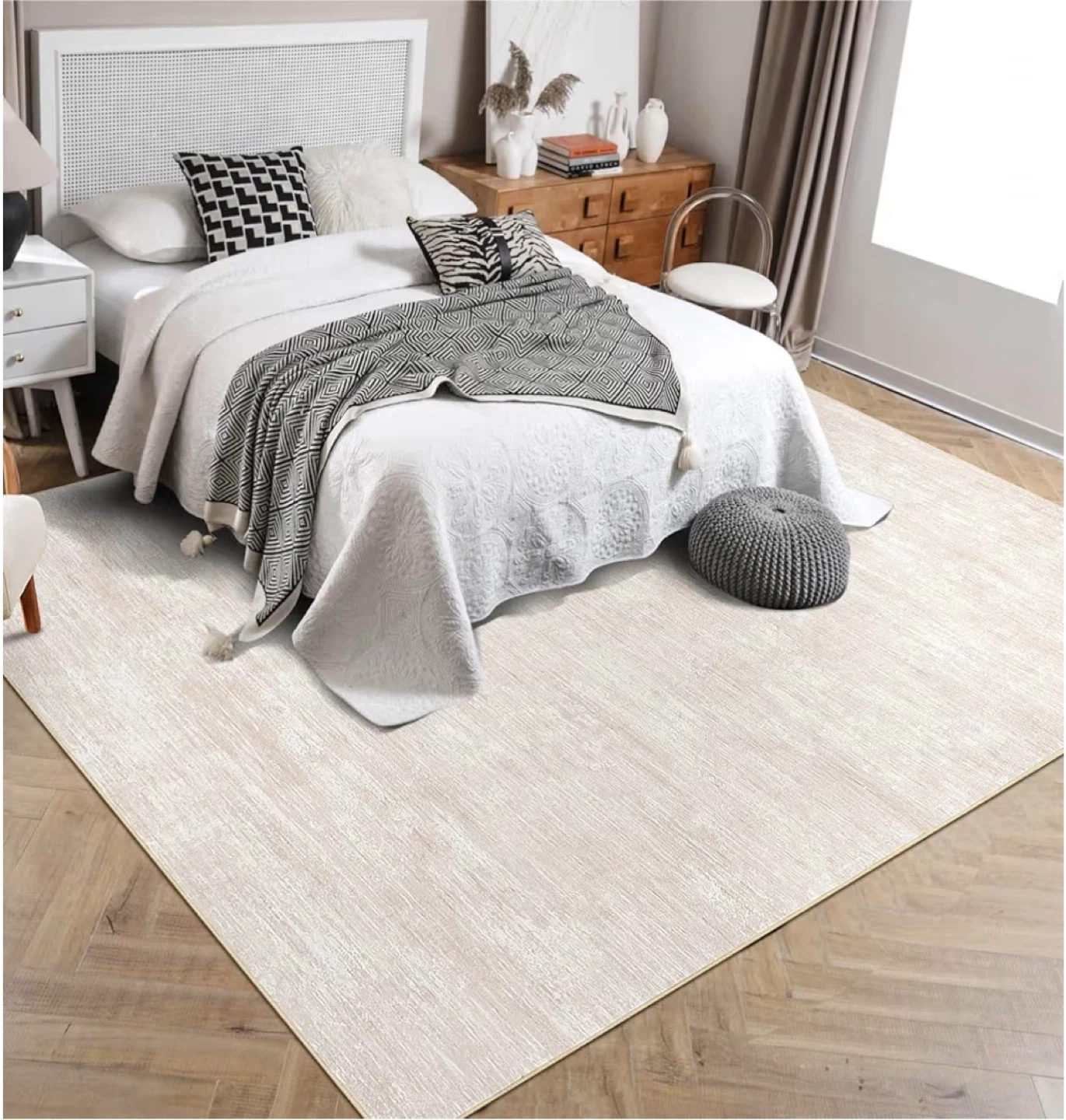 This rug features an ultra-soft surface and a durable edge. It has a non-slip TPR backing, making it safe and stable. It's machine washable and easy to maintain with a vacuum cleaner.