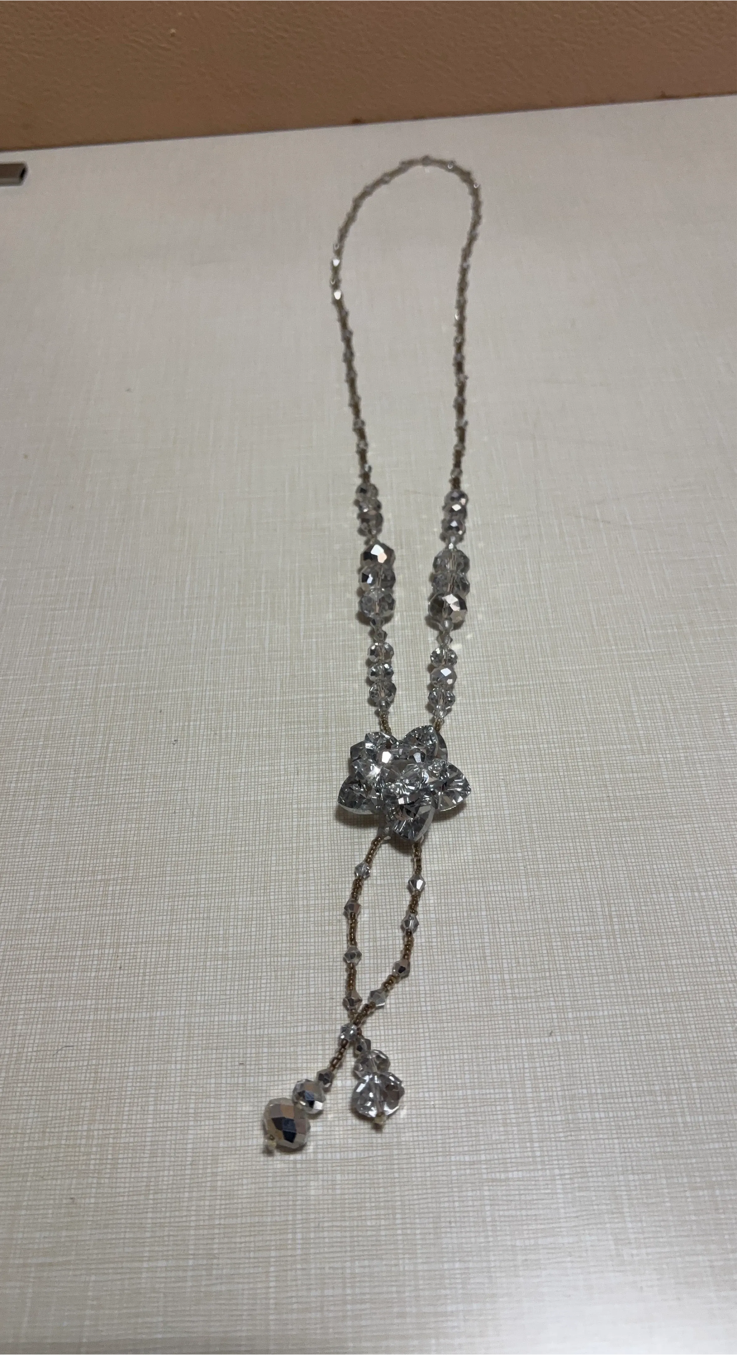 This is a long necklace featuring a sparkly floral pendant and clear crystal beads. It has small beads and larger faceted beads along the chain. It's a striking accessory for any outfit!