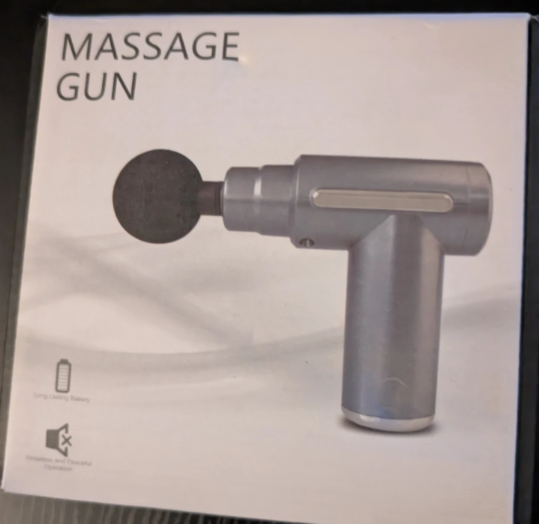 This massage gun comes with a long-lasting battery. It offers quiet operation. Includes original box and accessories. Useful for muscle recovery after workouts.