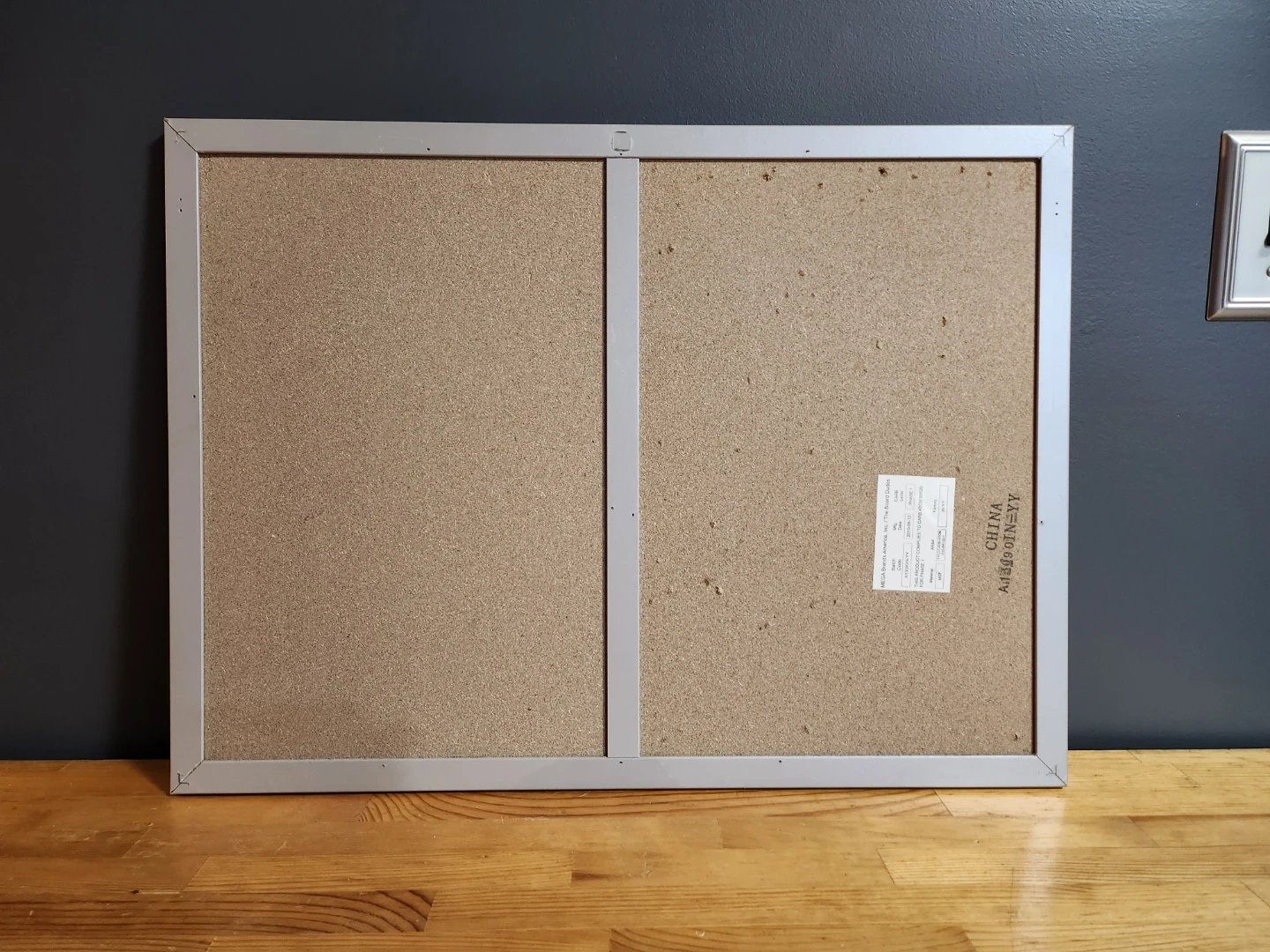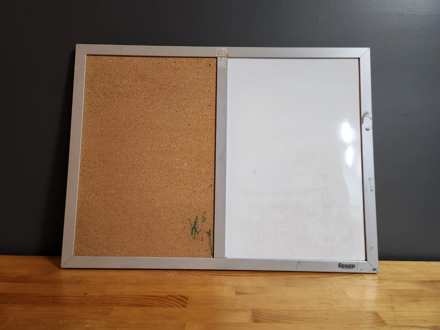 Whiteboard and Cork combo board from The Board Dudes. It has a whiteboard section suitable for dry erase markers and a corkboard section for pinning photos and documents. The frame is aluminum. Great for your office or home.