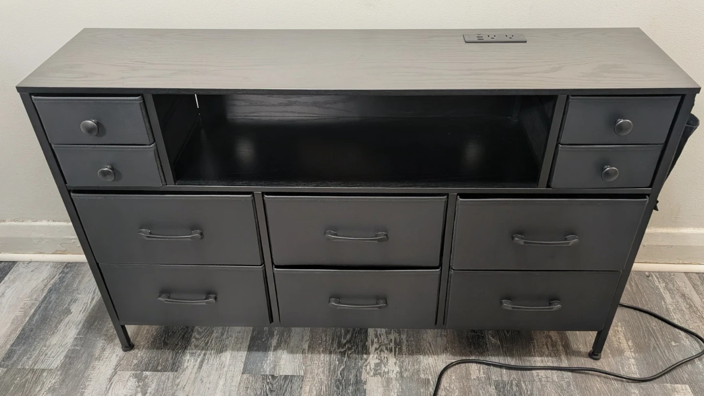 This fabric dresser features a sleek black finish with multiple drawers for storage. It's equipped with a built-in power strip on top for convenient charging. Three USB ports and one USB c. Comes with a central open shelf for media consoles or decor.