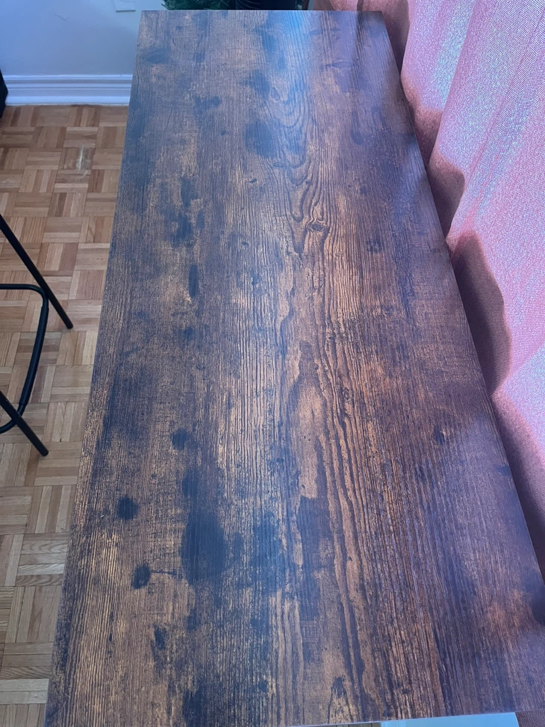 This console table has a rustic wood-look top with a black metal frame. It's a great size for a narrow space. Use it for a workspace or display table!