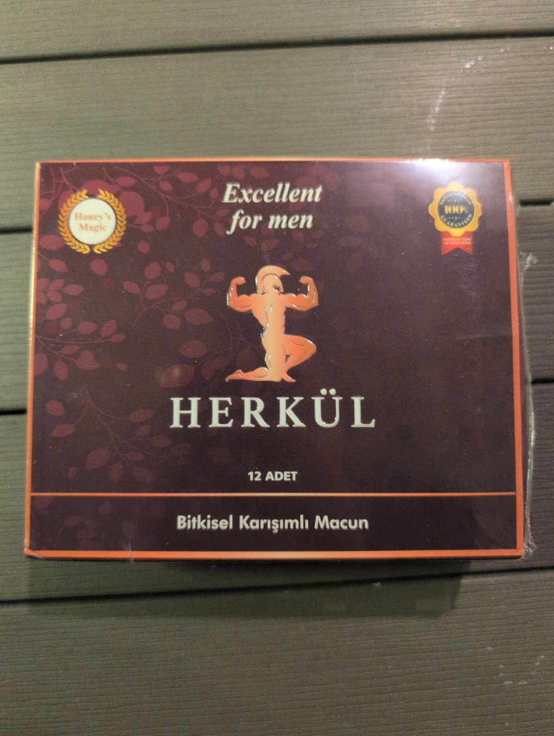 HERKÜL Bitkisel Karışımlı Macun comes in a 12-pack. It's an herbal blend for men. Ingredients include Carob tree molasses, Honey, Carob tree powder, Roost of fenugreek, Wild turmeric, Coriander, F Fennel, Black Cumin, Cinnamon, and others.