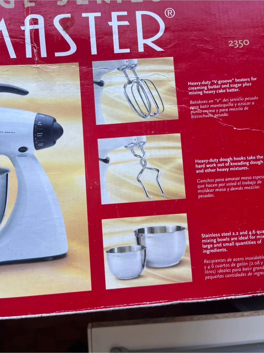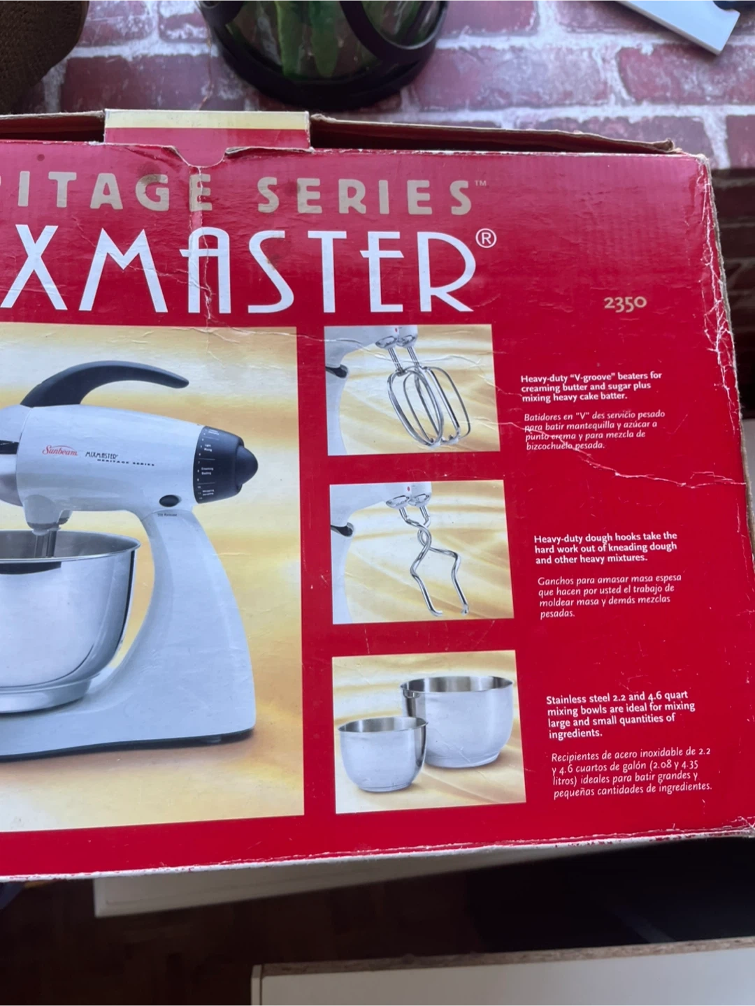 This Sunbeam Mixmaster features an adjustable bowl and 12 variable speeds with soft start. It comes with 2.2 and 4.6 quart stainless steel mixing bowls. The tilt-head design and non-skid rubber feet ensure stability during operation. It's great for creaming, beating, and kneading.