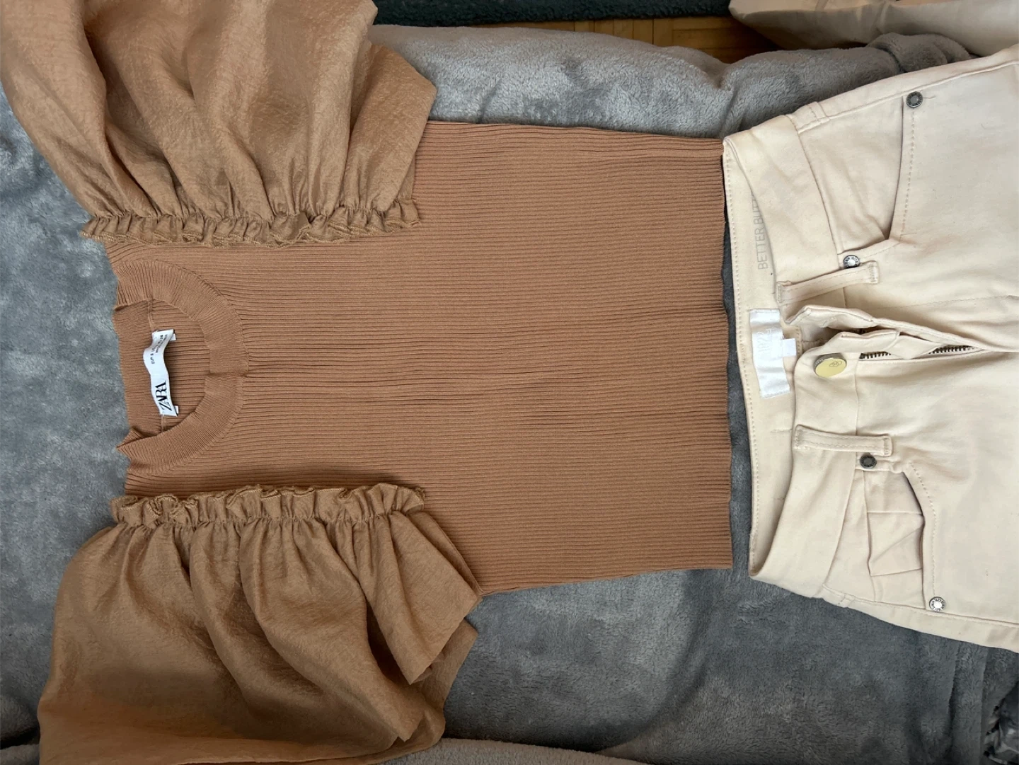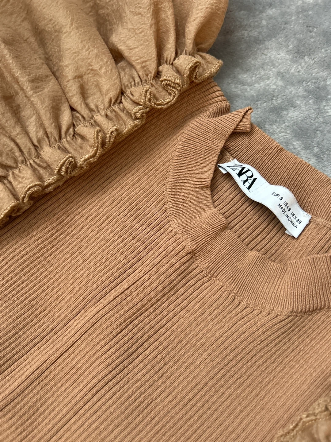 Zara ribbed knit top featuring puffed sleeves and a neutral beige pant set. Top is size S, pants are size US 8 (EU 28)very elastic and push up !Both are worn once, only serious requests , both for super price
