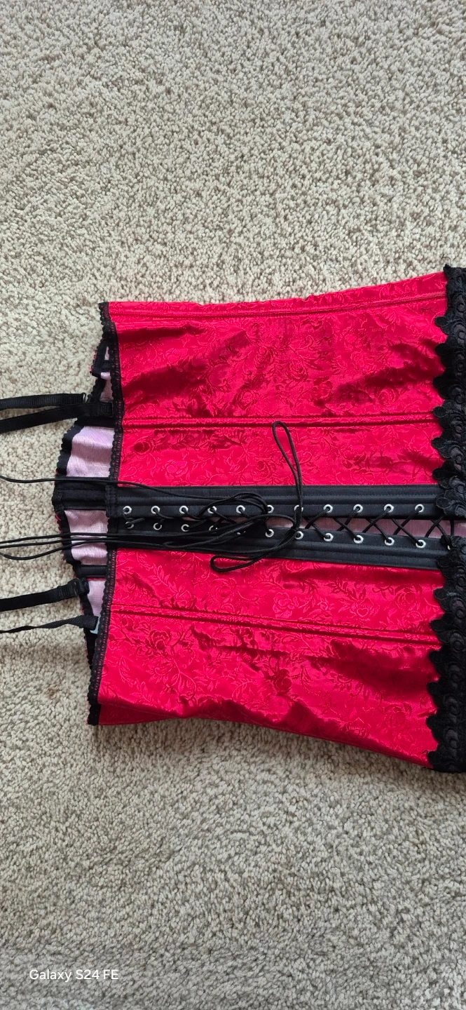 This stunning red corset features intricate black lace trim , perfect for adding a touch of elegance to any outfit. The adjustable laces insure a perfect fit. ,, making it a versatile addition to your wardrobe.