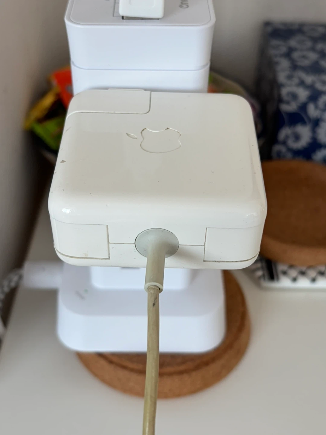 This is a silver Apple MacBook Air laptop. It comes with a charger. It's ready for a new owner to set it up!