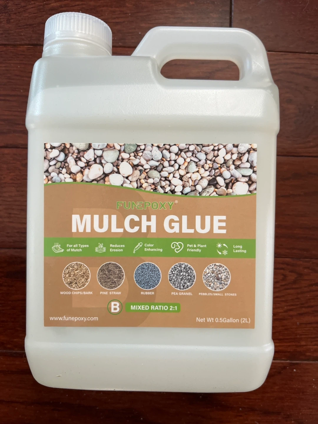 This is FunEpoxy Mulch Glue in a 0.5-gallon container. It's pet and plant friendly and long-lasting. Apply adhesive immediately after mixing to prevent hardening. Mixed ratio is 2:1.