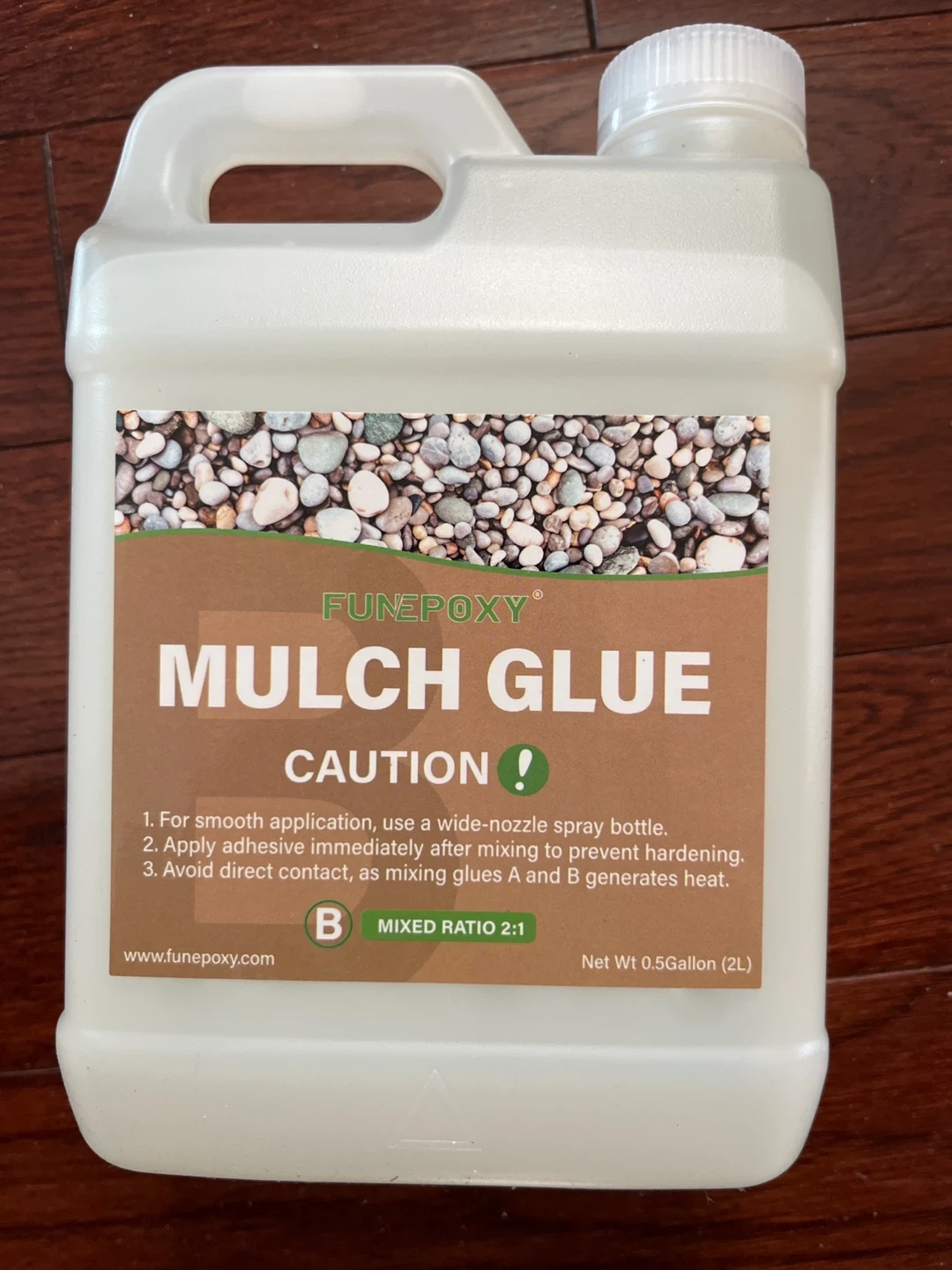 This is FunEpoxy Mulch Glue in a 0.5-gallon container. It's pet and plant friendly and long-lasting. Apply adhesive immediately after mixing to prevent hardening. Mixed ratio is 2:1.