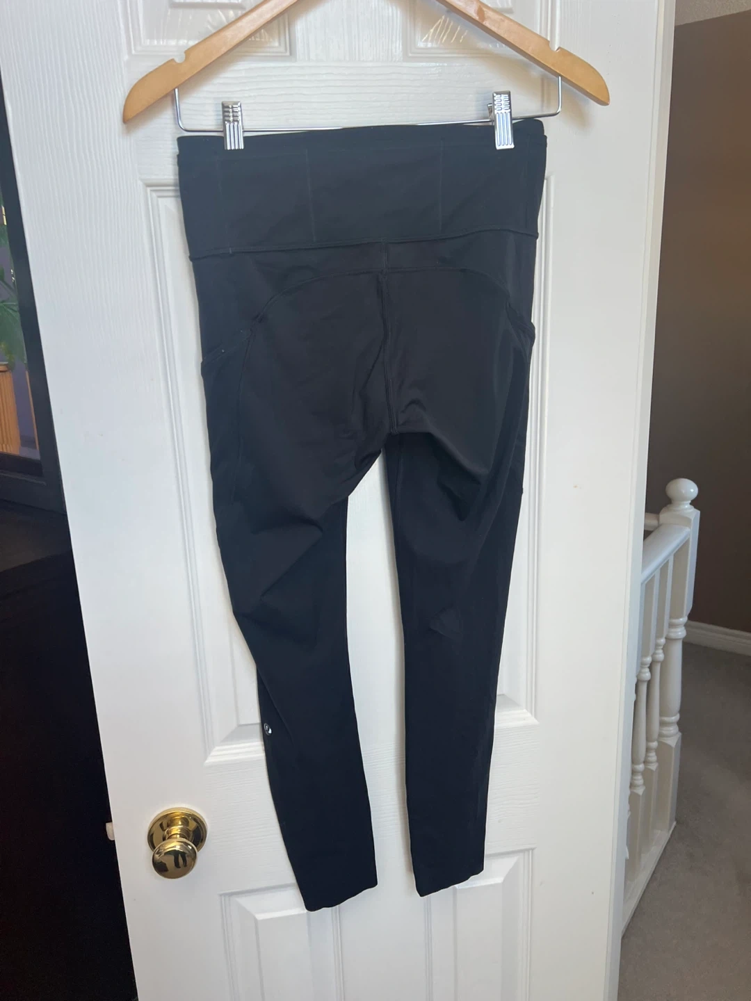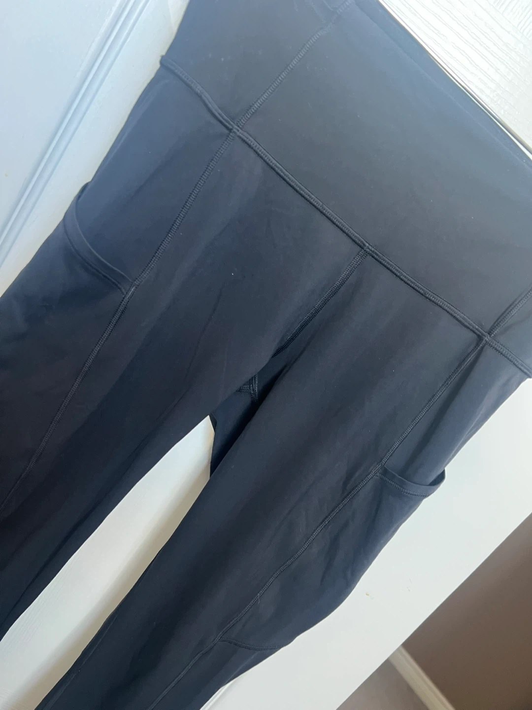 Lululemon black leggings. It's a size 6 with side pockets. Perfect for workouts or everyday wear!