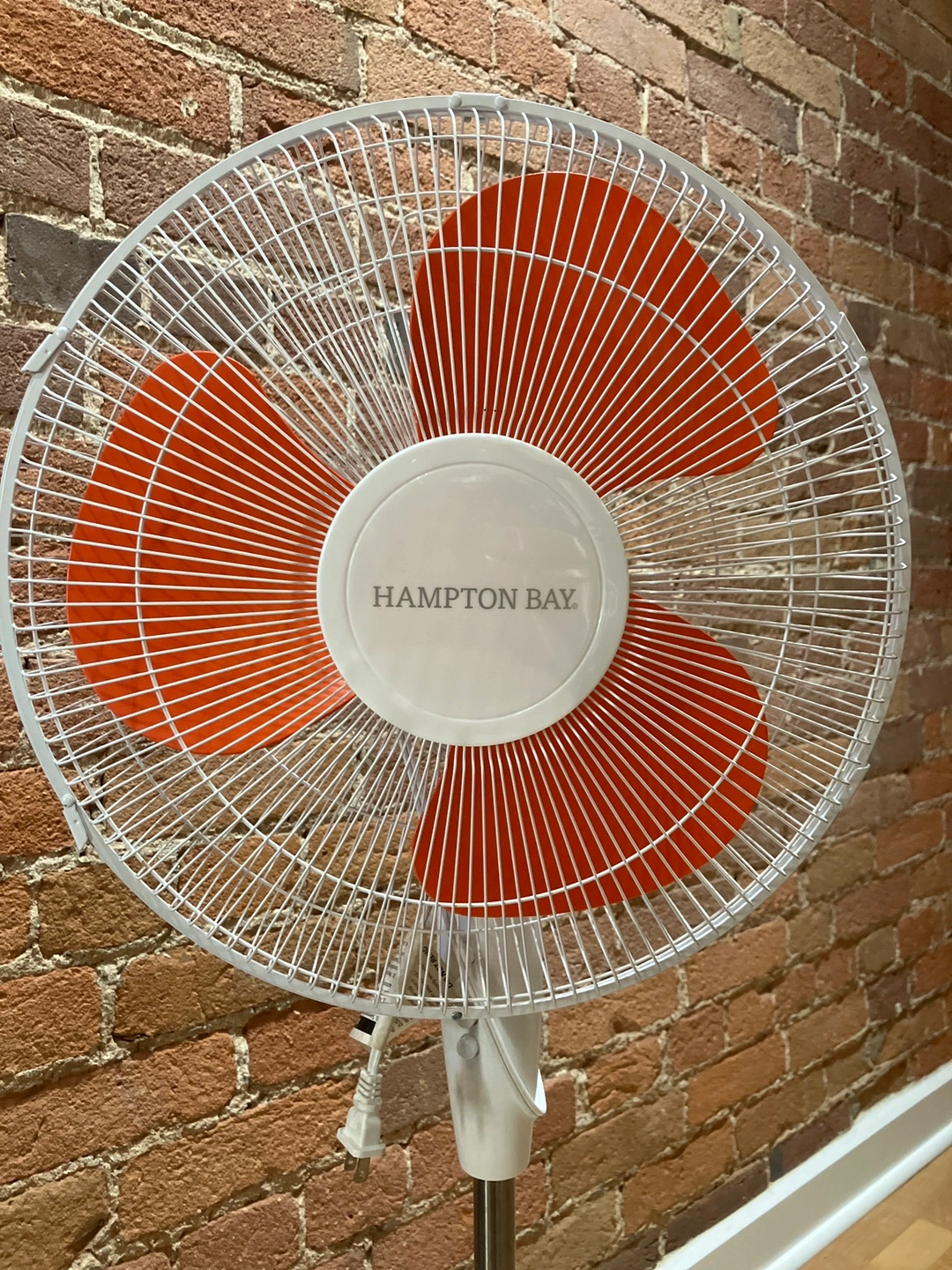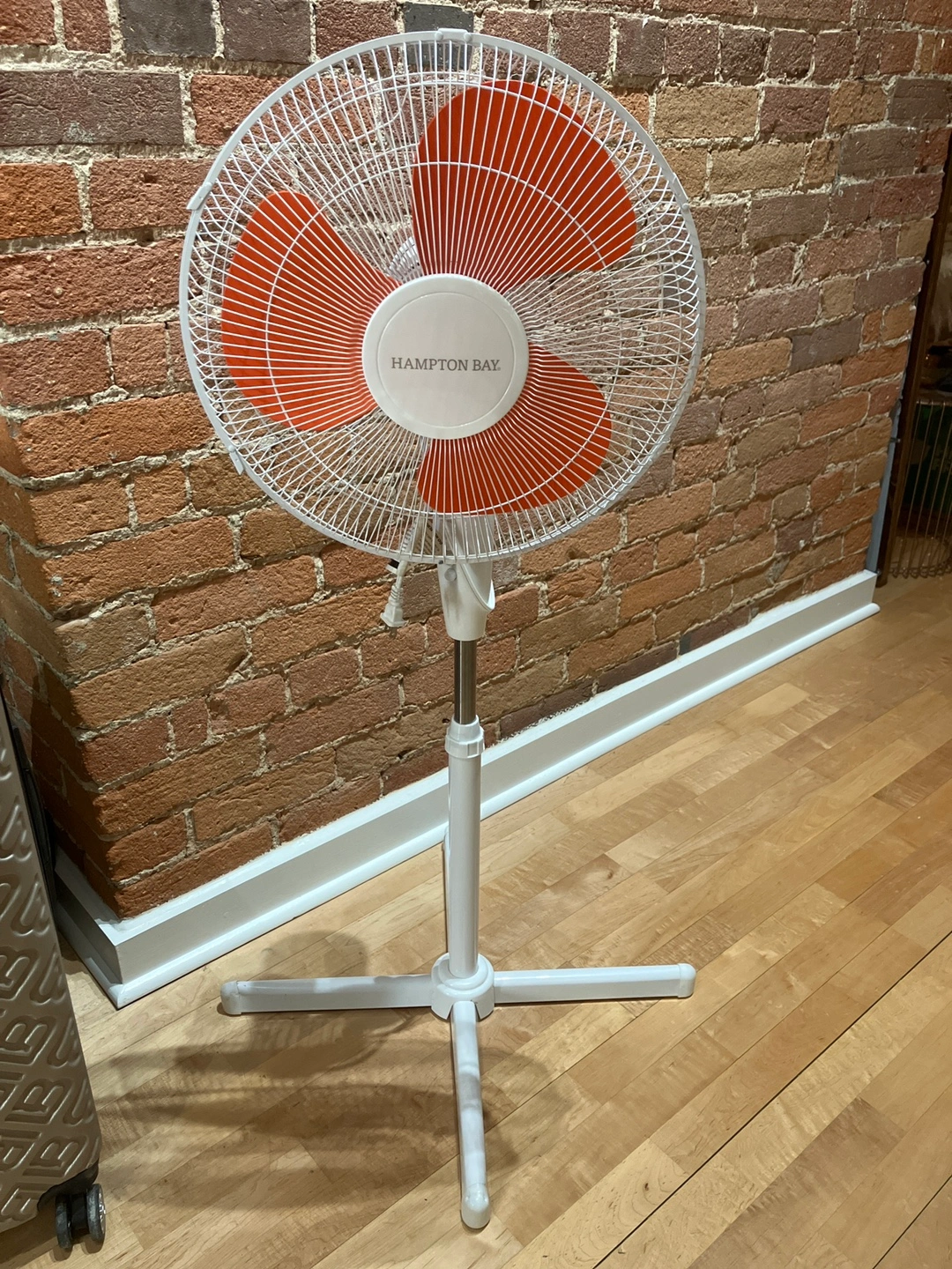 This Hampton Bay pedestal fan is white with distinctive orange fan blades. It's a great way to keep your space cool. The fan's height is adjustable. Works great, but selling for cheap as you can see there is some superficial damage to the base.