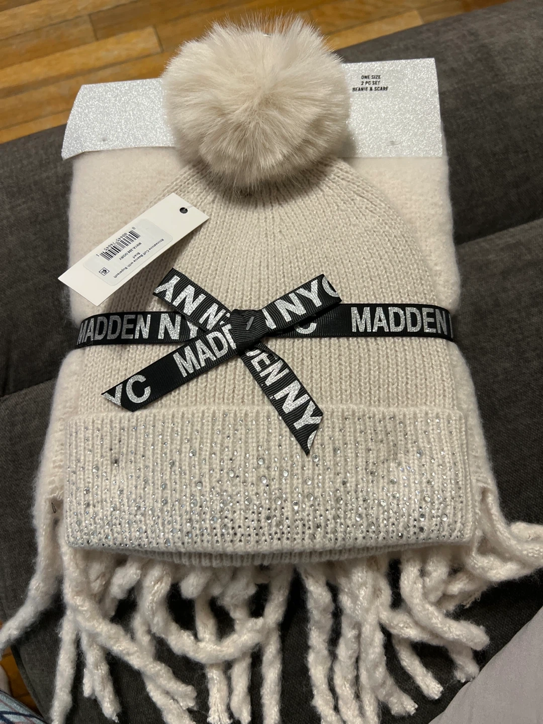This is a Madden NYC 2-piece set including a beanie and scarf. The beanie features a fuzzy pom-pom and rhinestone cuff. The scarf has a fringe detail. One size fits most.